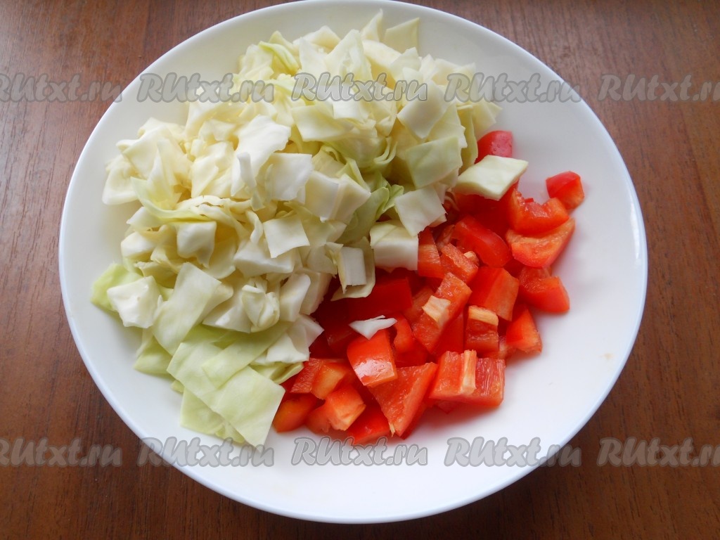 Капусту и очищенный от семян болгарский перец также нарезать кубиками.