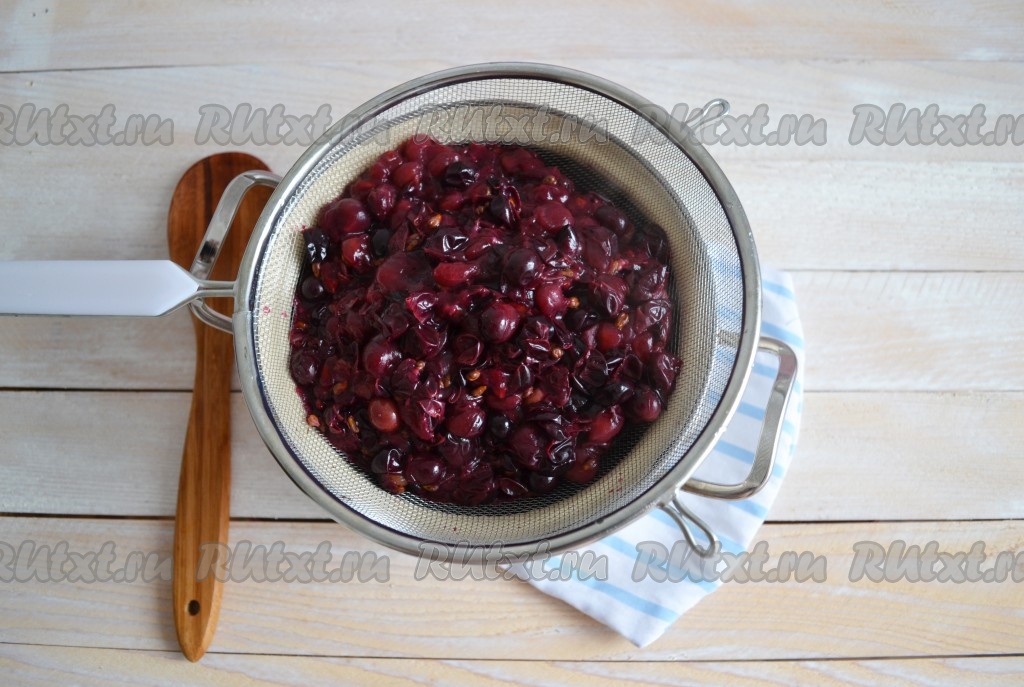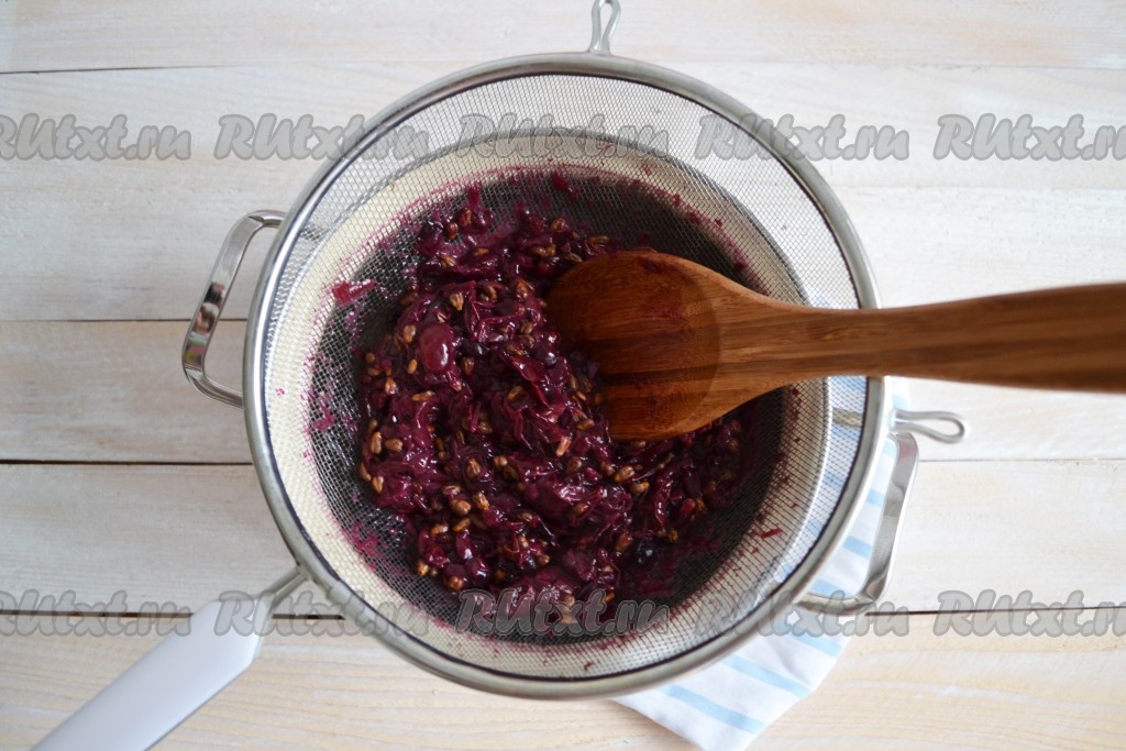 Помешивая ложкой ягоды в сите, максимально выдавить в кастрюлю сок и нежную мякоть. В сите должна остаться малая часть отходов: кожица и косточки винограда.