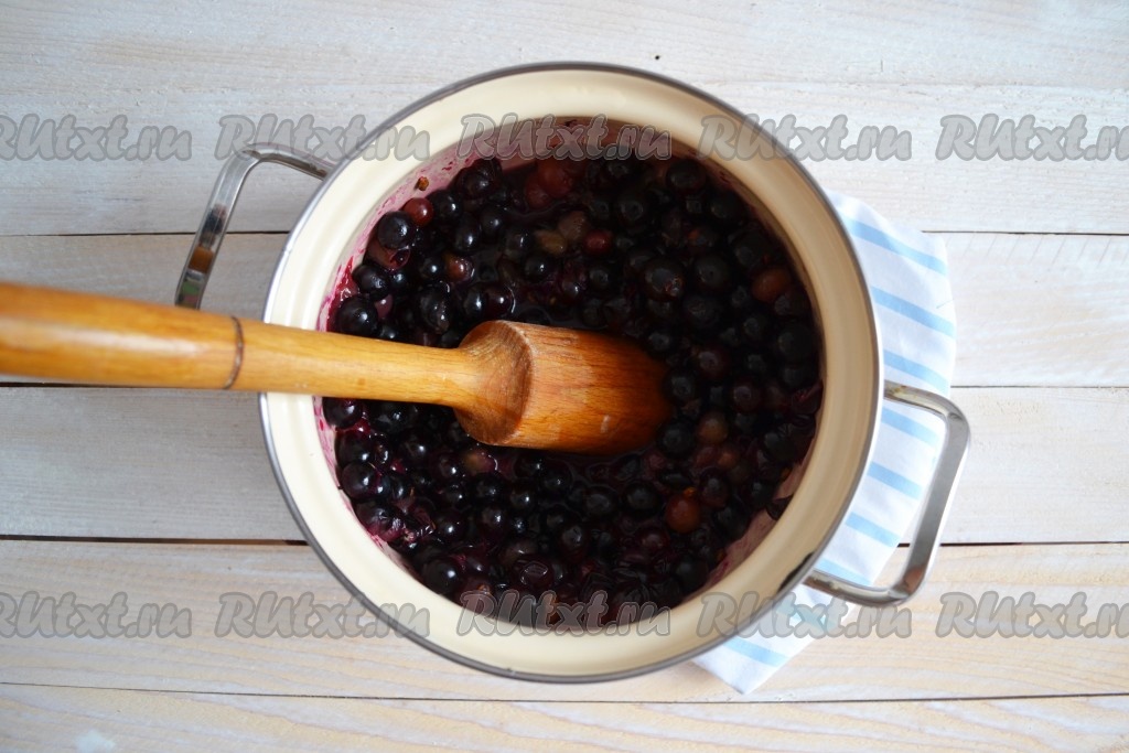 Поставить кастрюлю с виноградом на слабый огонь и, периодически помешивая, проварить 10 минут. Дополнительной жидкости не нужно, после промывания ягоды довольно мокрые, а с первых минут варки начнет выделяться сок. Затем с помощью толкушки потолочь всю массу и проварить на слабом огне еще 10-15 минут.