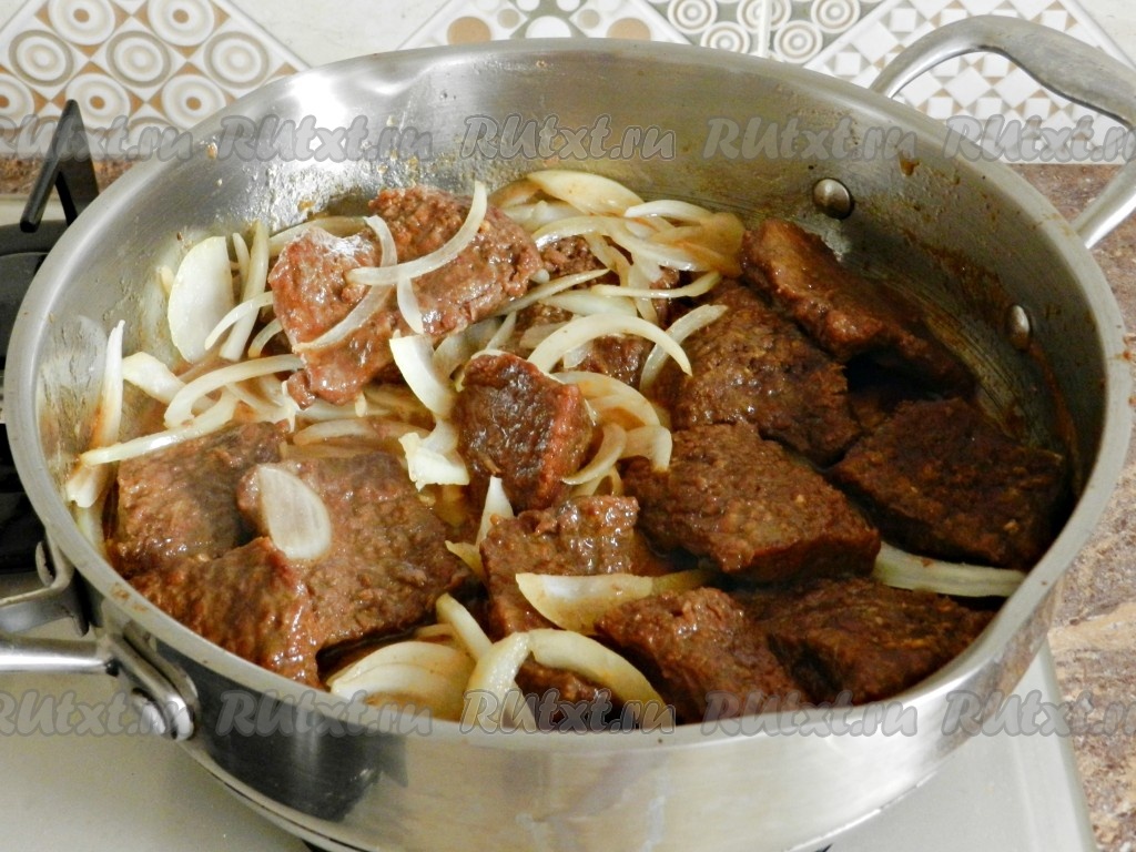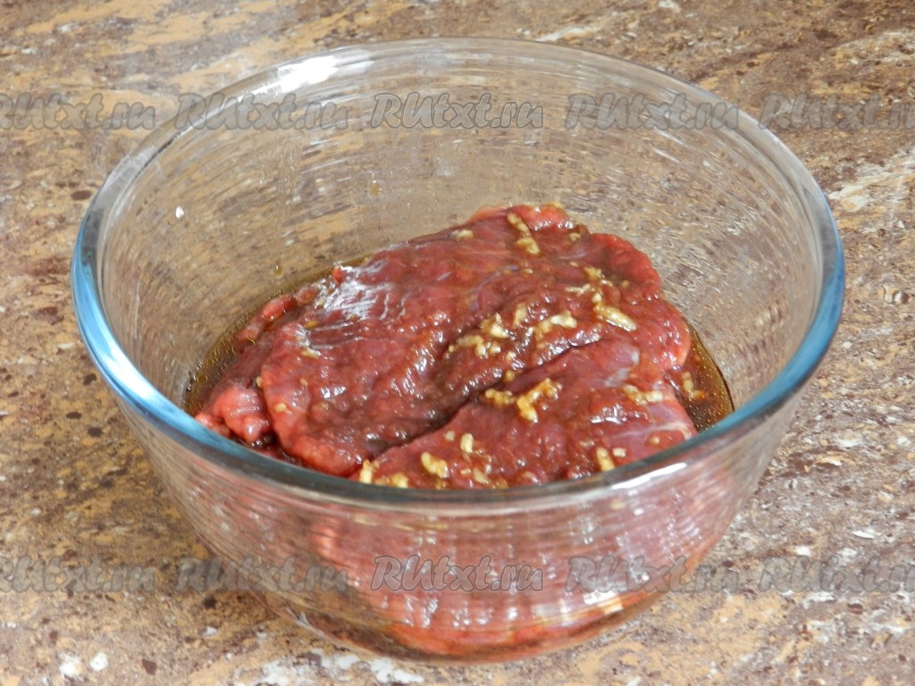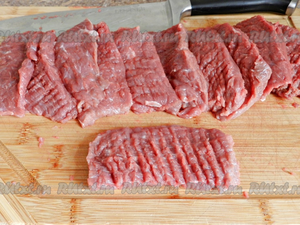Говядину вымыть, нарезать поперек волокон кусочками толщиной около 1 см.