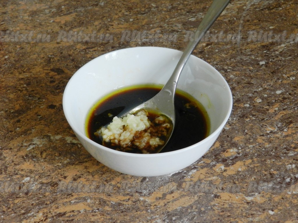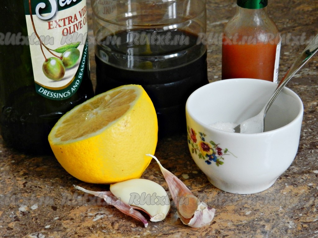 Смешать соус "Терияки", растительное масло, соус "Табаско" и лимонный сок. Добавить сахар и пропущенный чрез пресс чеснок. Попробуйте на вкус. Солить не надо, так как соль содержится в соевом соусе "Терияки". Маринад получается скорее сладковатым, чем соленым. Если вы замените "Терияки" на обычный соевый соус, маринад будет менее сладким.