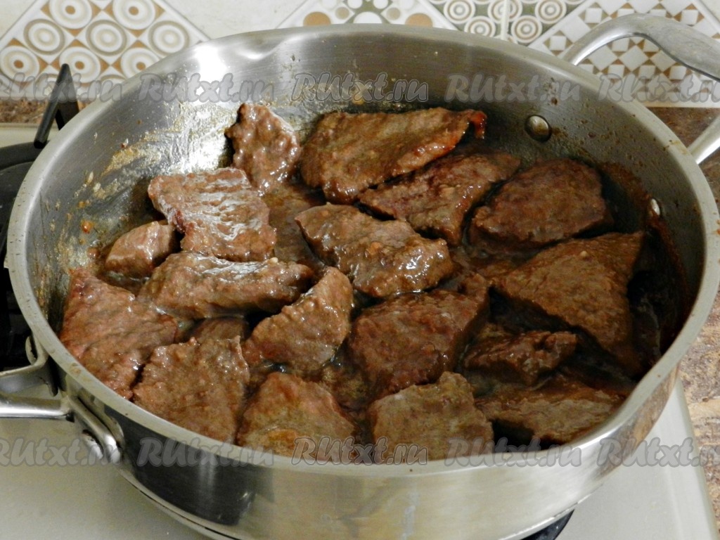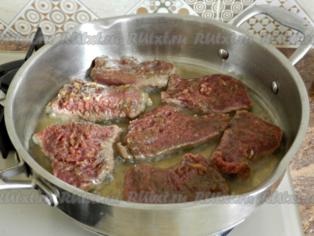 В сковороде разогреть растительное масло и обжарить кусочки мяса с обеих сторон.