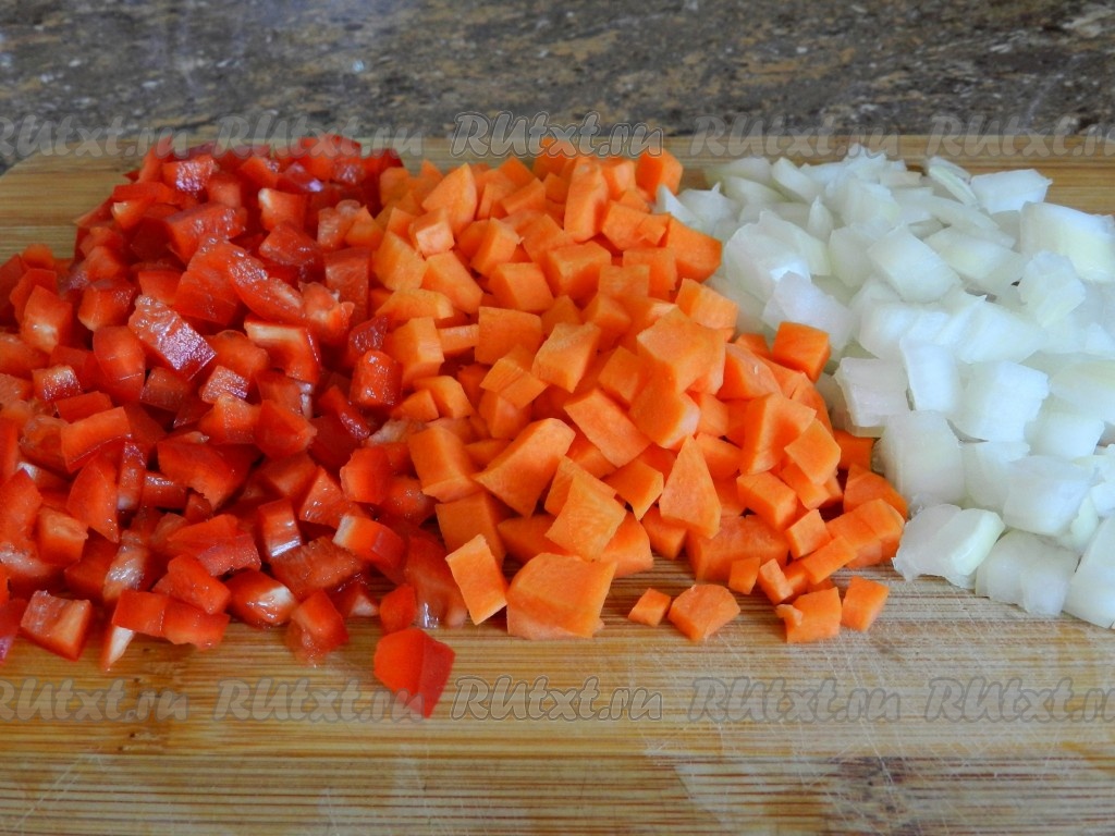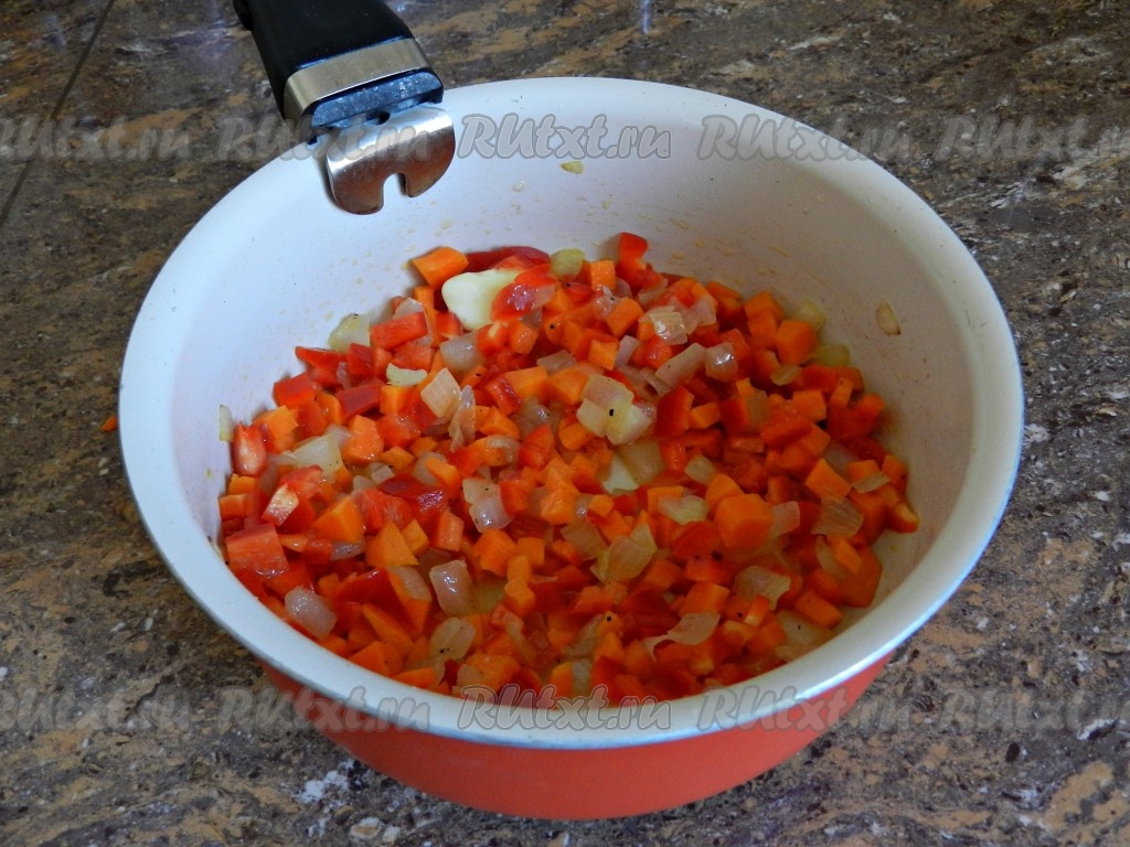 Обжарить лук на смеси растительного и сливочного масел, посолить и поперчить. Добавить морковь и перец, обжарить все вместе до прозрачности.