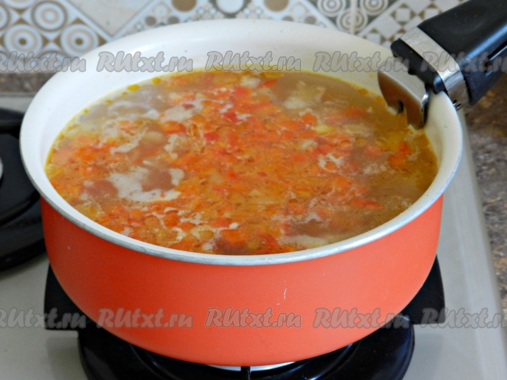 Для приготовления супа необходимо заранее сварить мясной или куриный бульон. Я приготовила бульон из домашней курицы. Лук, морковь и перец очистить и нарезать небольшими кубиками.