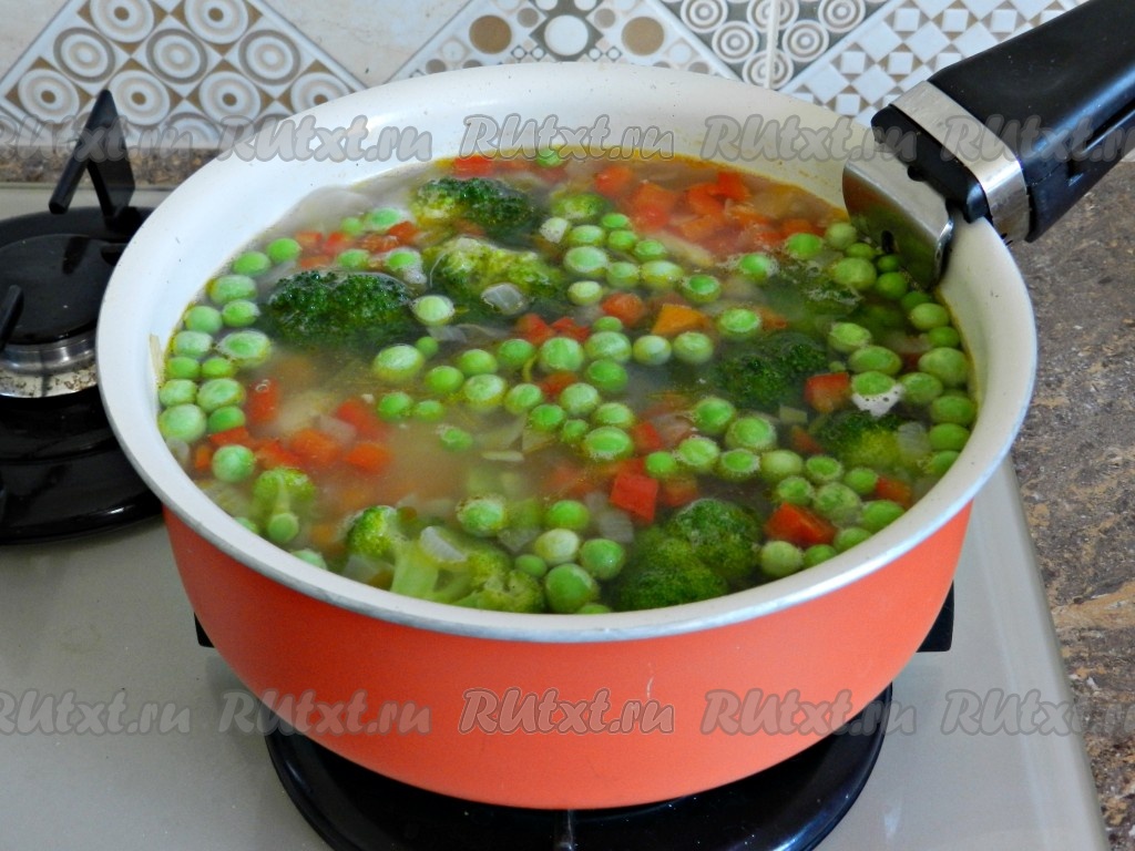 Залить овощи процеженным бульоном, довести до кипения и варить на медленном огне 10 минут.