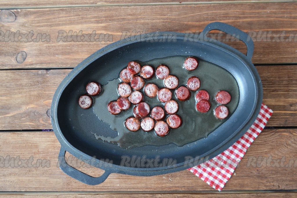 На сковороде на среднем огне разогреть подсолнечное масло, выложить колбасу и обжарить с двух сторон, чтобы она прогрелась (это займёт примерно 2 минуты). А если куски колбасы побольше, то прогрейте на сковороде чуть подольше.