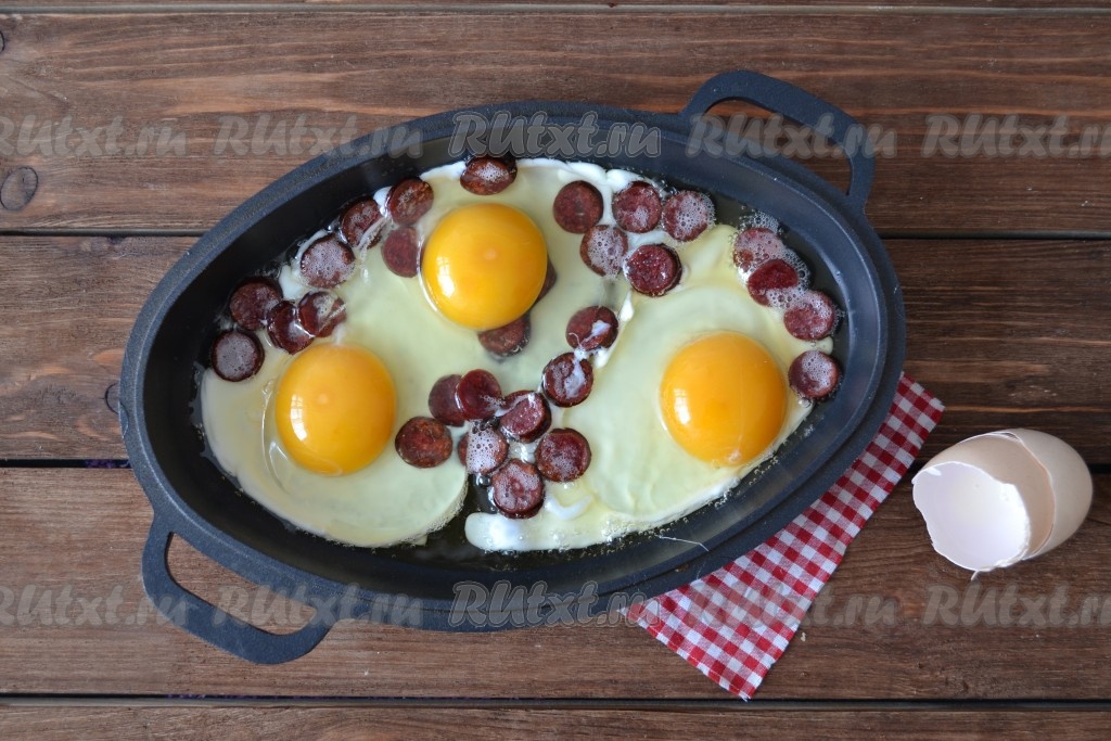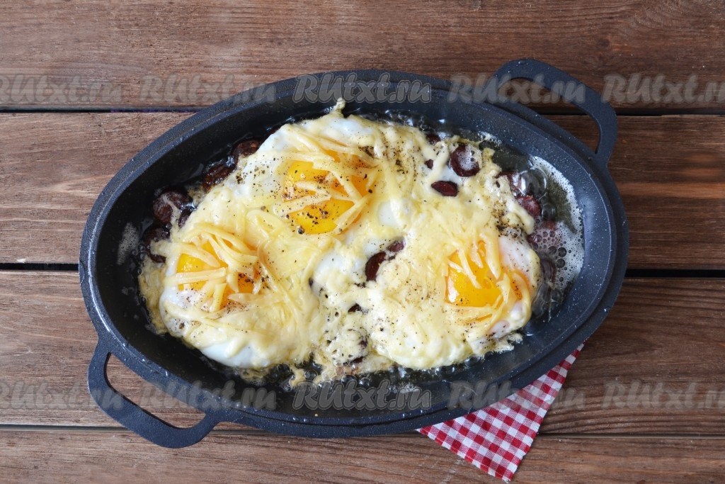 Вбить поочередно в сковороду с колбасой яйца. По вкусу добавить соль и молотый перец. С солью нужно не переборщить, так как и колбаса, и сыр содержат в себе соль.