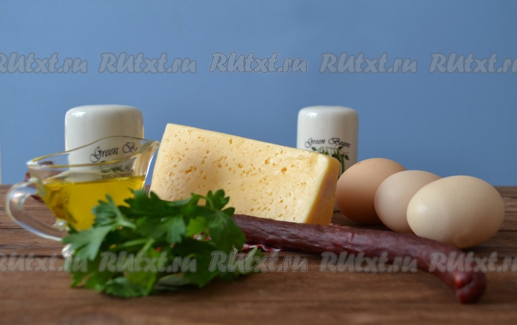 Подготовить все ингредиенты. Колбаса подойдет любая: копченая или вареная, а для любителей острого - можно использовать и чили колбасу.