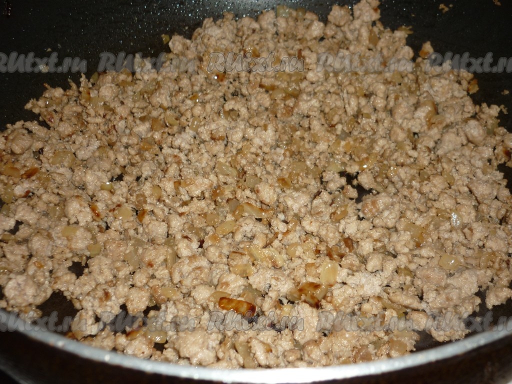 На небольшом огне, постоянно помешивая и разбивая комочки, обжарить фарш до испарения жидкости (до готовности), в течение 10-15 минут. Добавить соль и чёрный молотый перец по вкусу.