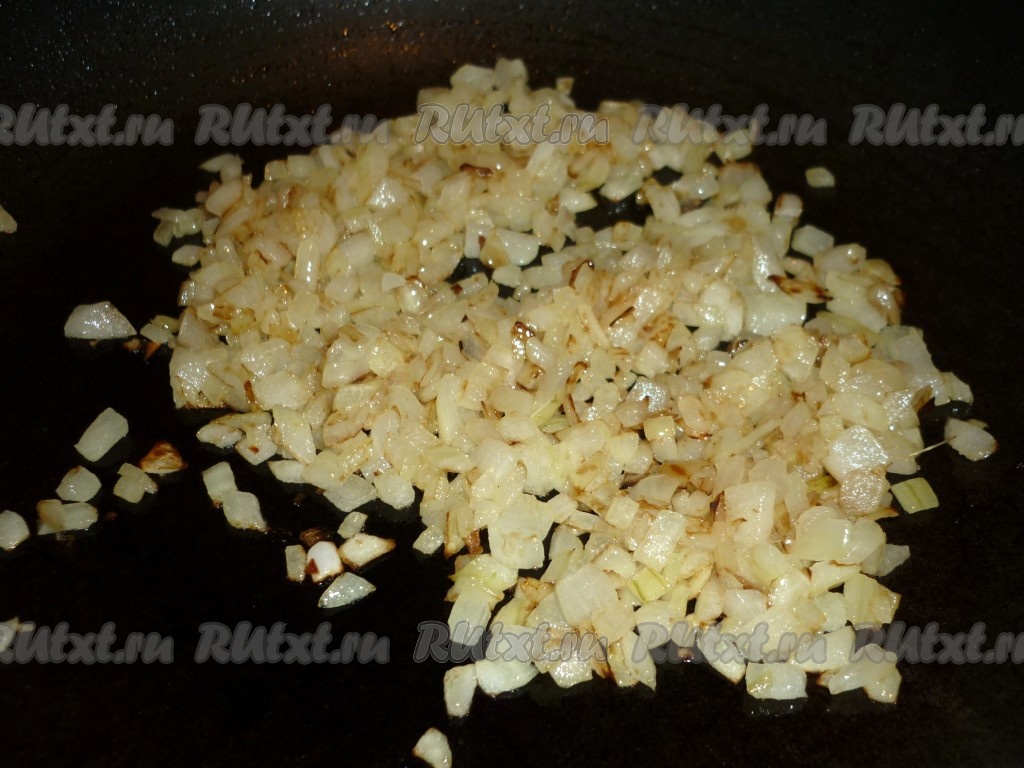 Нарезанный лук обжарить на небольшом количестве смальца или растительного масла на среднем огне, помешивая, до прозрачности, в течение 5-7 минут.