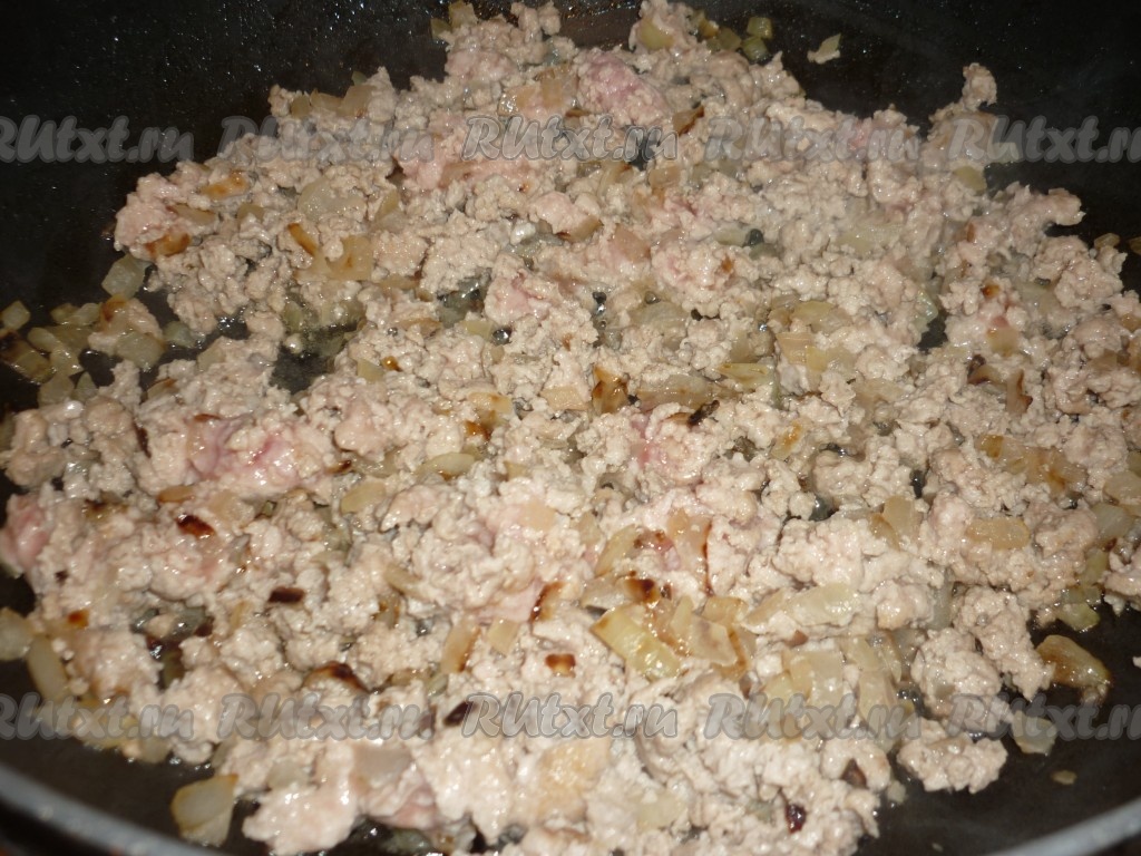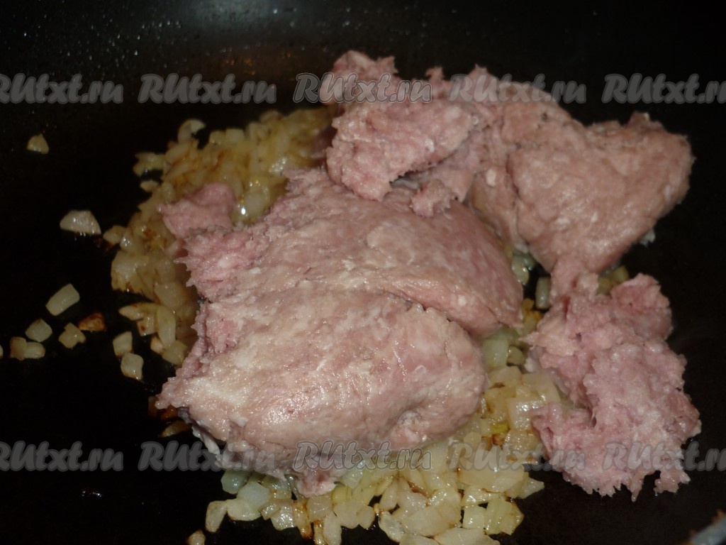 Добавить к обжаренному луку на сковороду мясной фарш. Я использовала свиной фарш, но можно заменить его на говяжий.