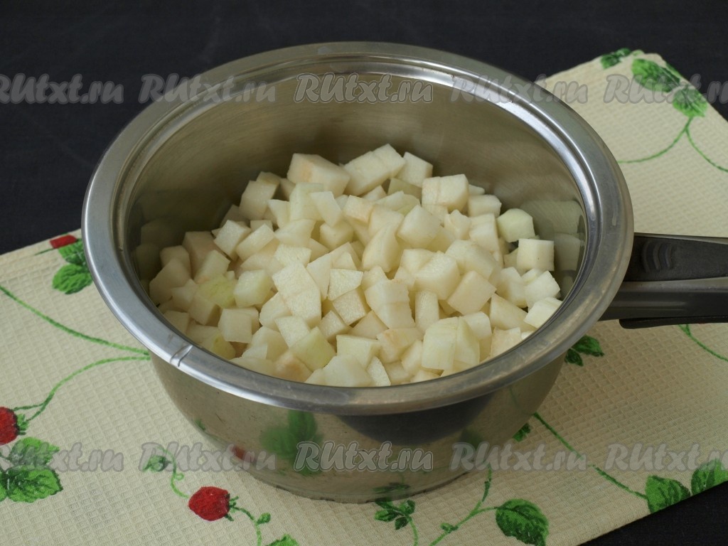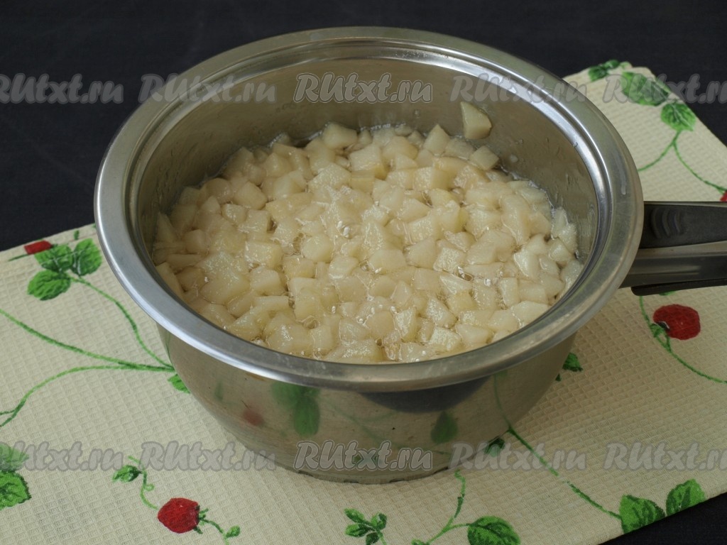 Нарезанные груши переложить в сотейник и налить воду. Когда вода закипит, варить груши 5 минут под закрытой крышкой на не большом огне.