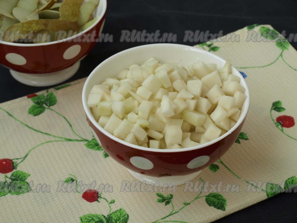 Груши следует вымыть и очистить. Нарезать груши кубиками. У меня чистый вес груш был 380 грамм, столько же понадобится сахара.