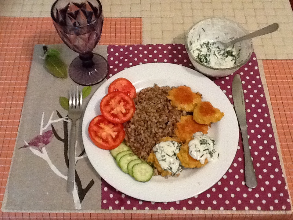 Наши куриные котлетки с карри готовы! На гарнир можно подать гречку и свежие овощи. А также сметанный соус с чесночком и зеленью.