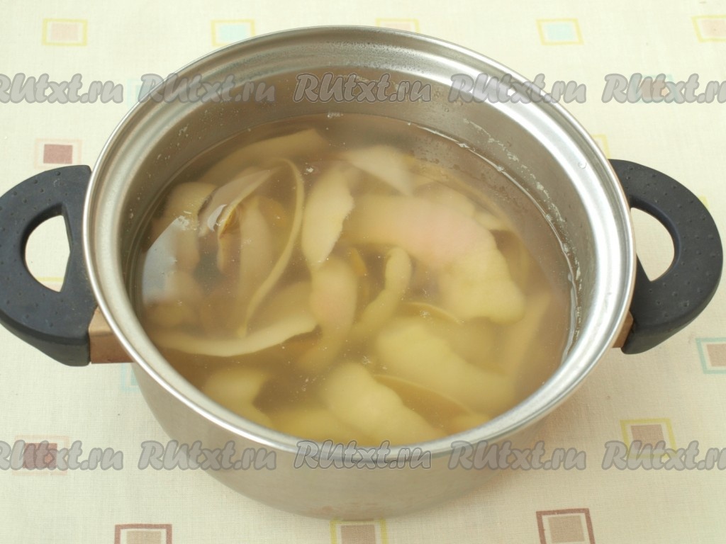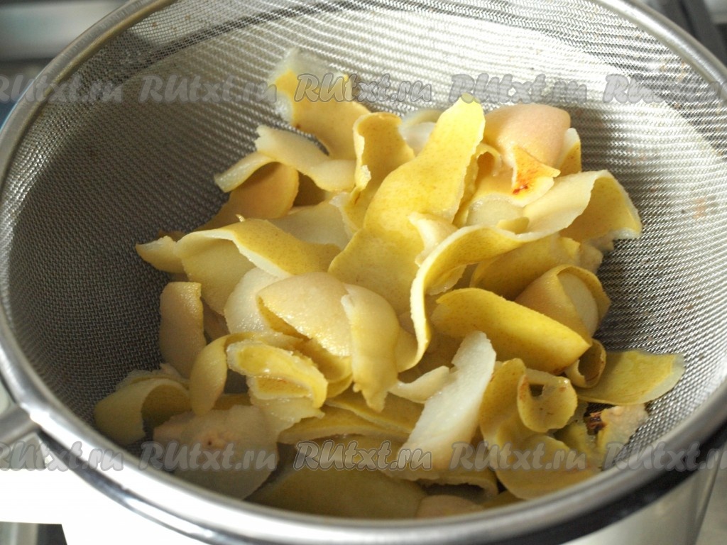 Залить шкурки груш литром воды и поставить на огонь, довести до кипения и варить на небольшом огне 15 минут.