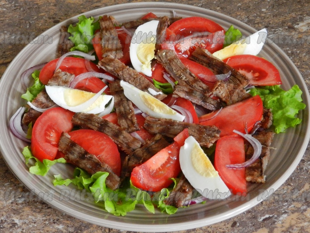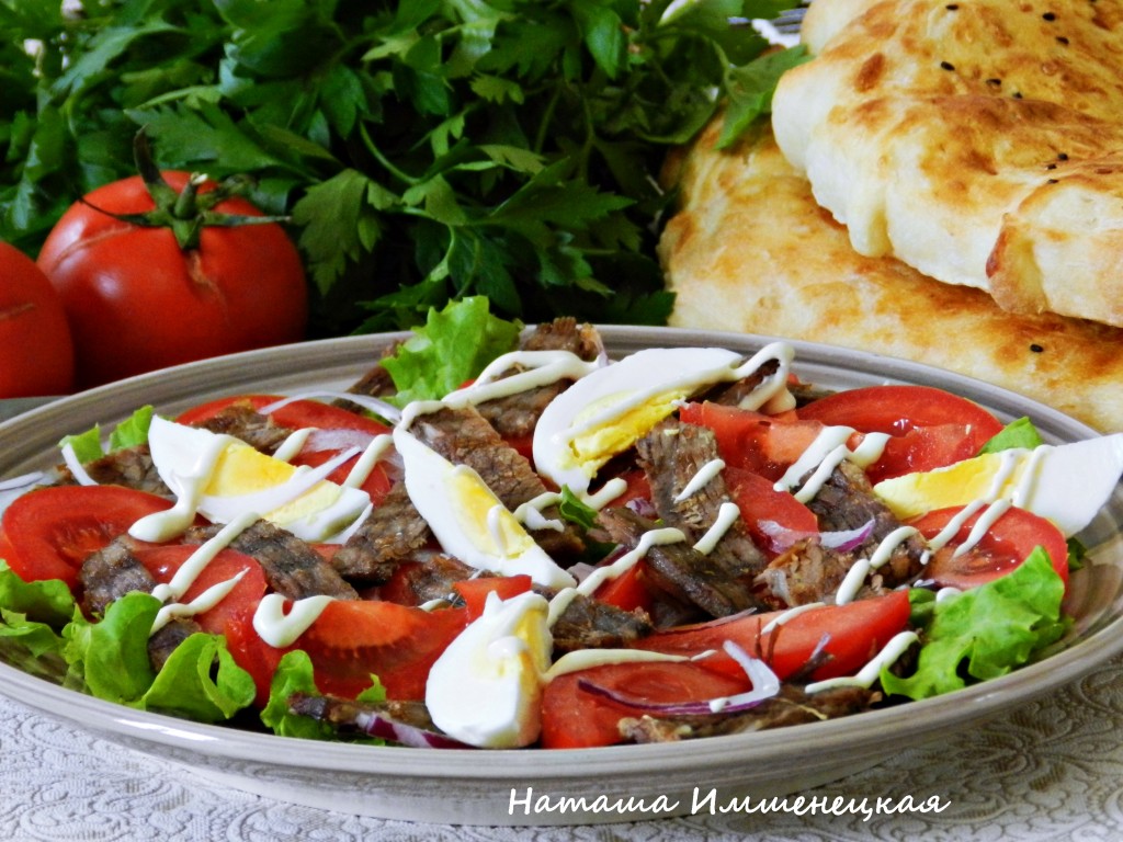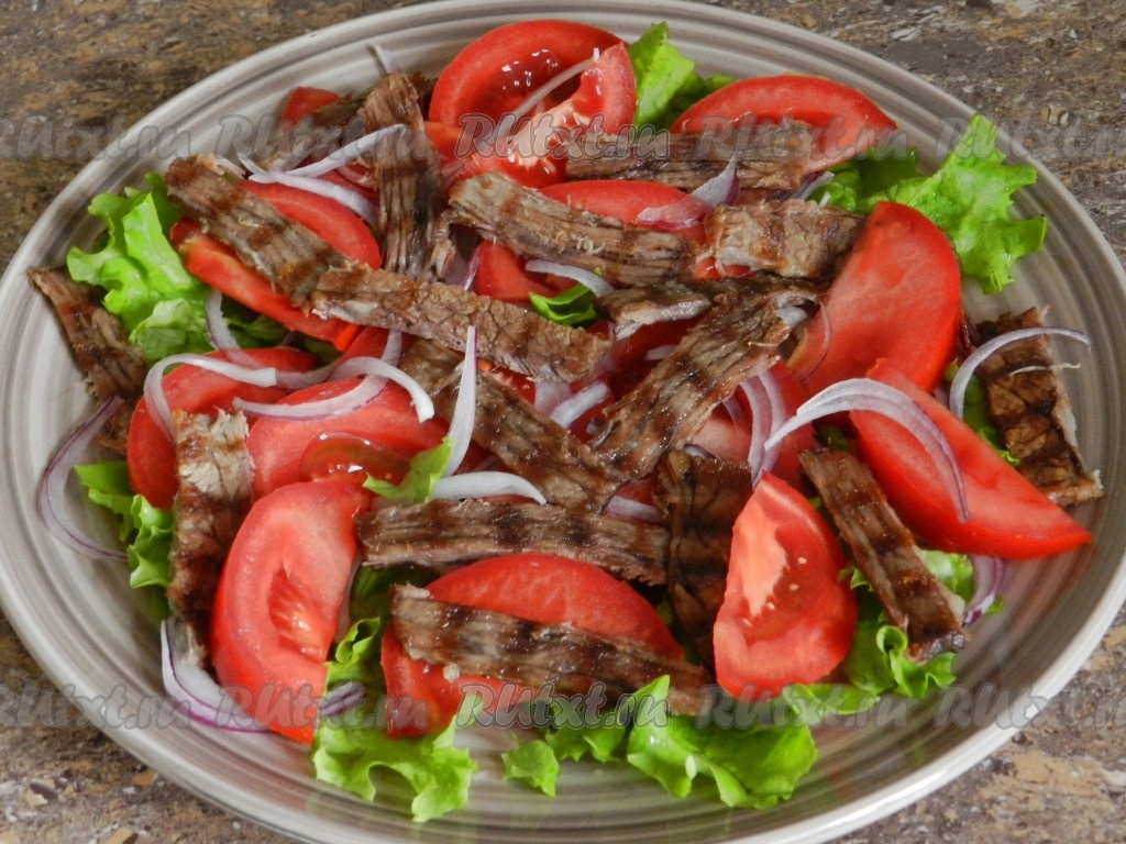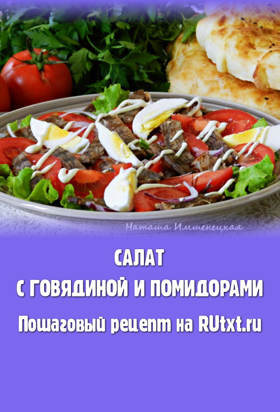 Заправить салат заправкой и сразу же подавать. Вкусный, сытный салат с отварной говядиной и помидорами готов.