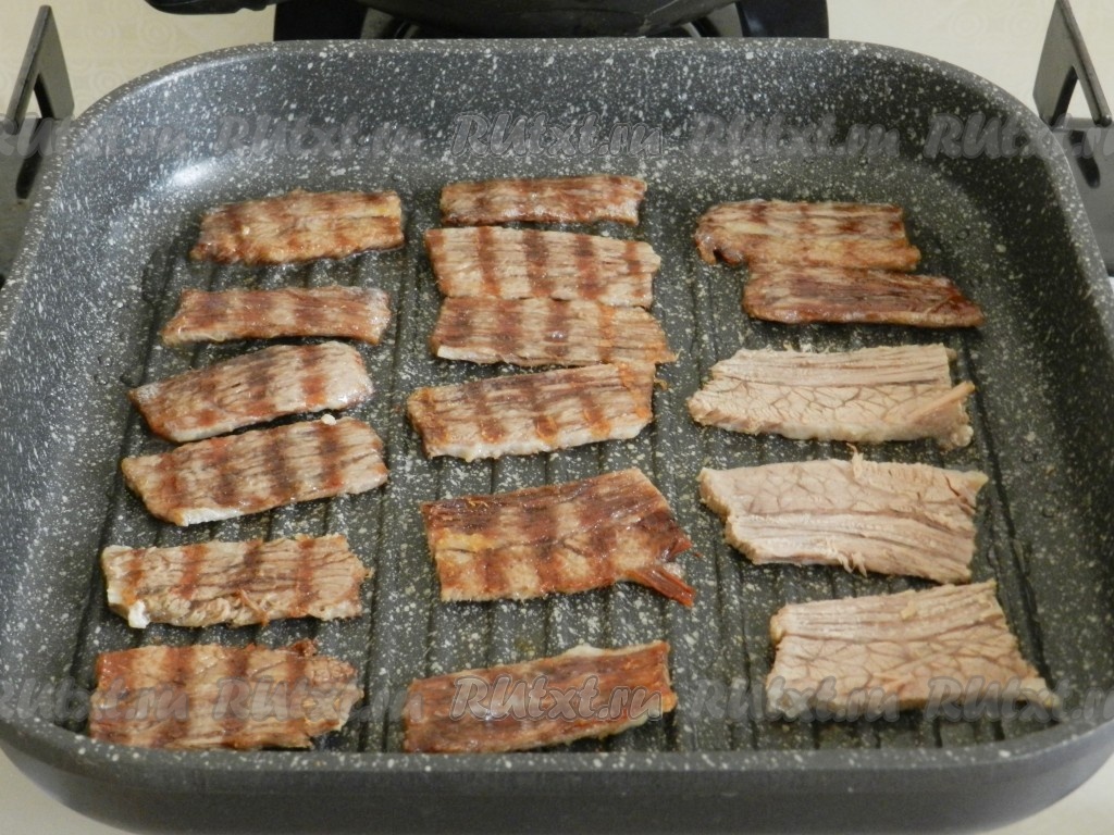 Разогреть сковороду гриль и обжарить мясо по несколько секунд с каждой стороны. Если вы не хотите обжаривать мясо, можете пропустить этот шаг.
