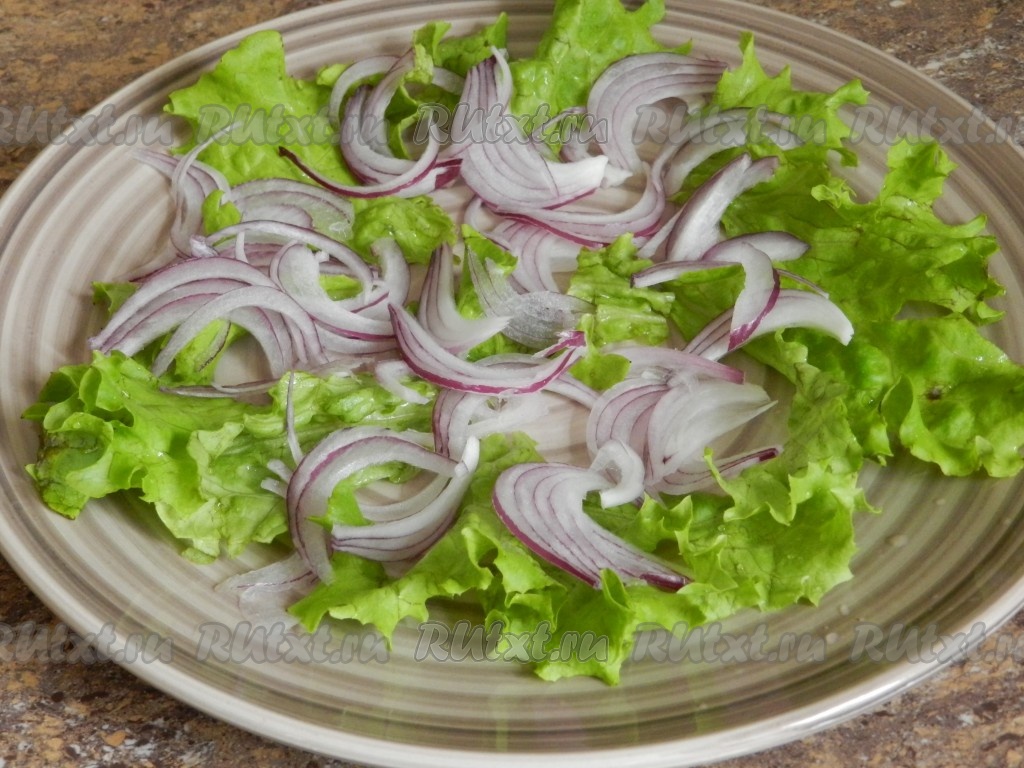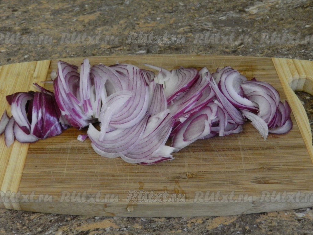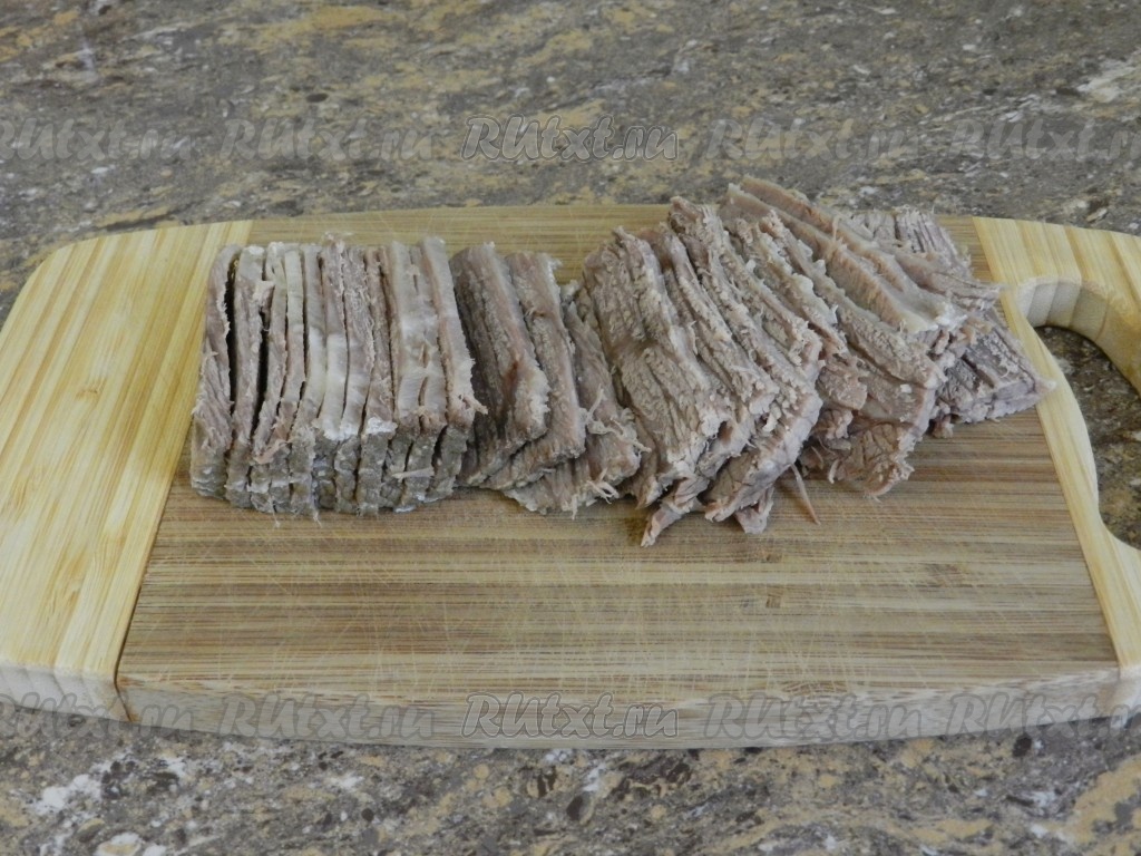 Отварную говядину нарезать небольшим тонкими ломтиками.