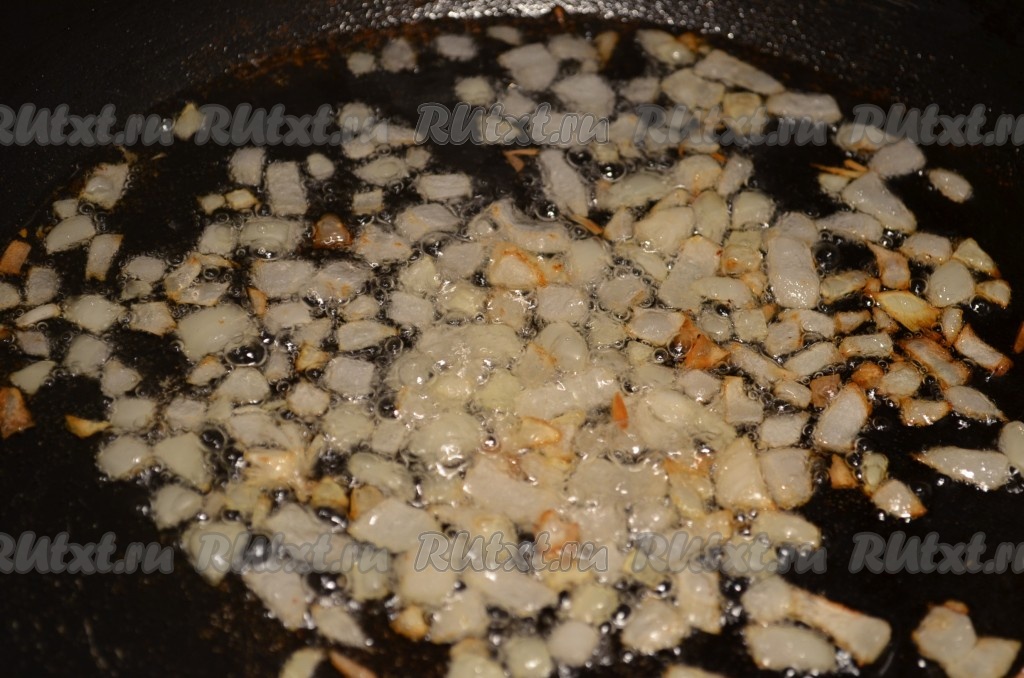 Очищаем репчатый лук, нарезаем мелко и обжариваем на оливковом (или растительном) масле, помешивая, до золотистого цвета.