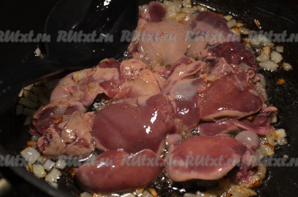 Предварительно промытую куриную печень добавляем к луку, перемешиваем. Обжариваем на среднем огне, периодически перемешивая, до изменения цвета печени и выделения при разрезании прозрачного сока без примесей крови (примерно, 5-7 минут).