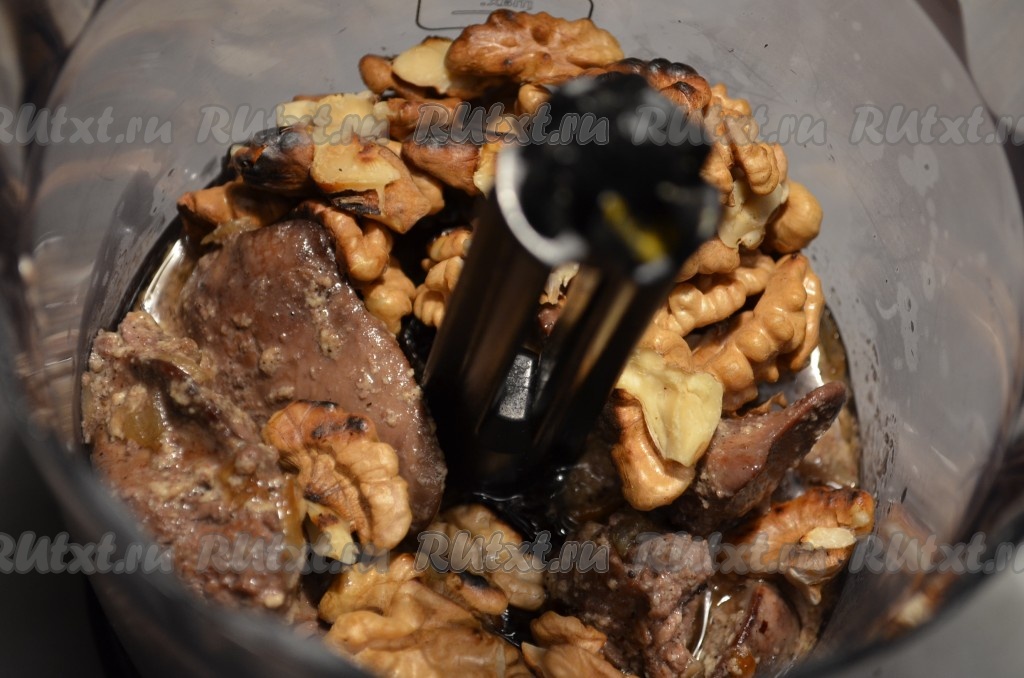 Куриную печень, протушившуюся вместе с луком в сливках, и грецкие орехи перекладываем в блендер, измельчаем до однородности.