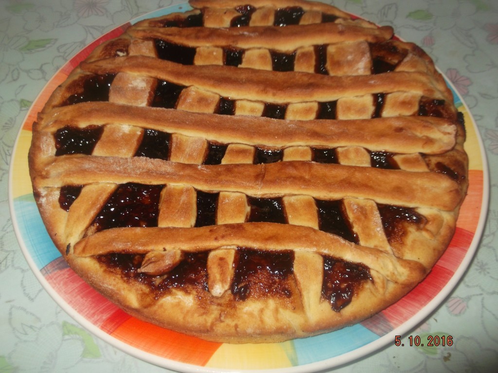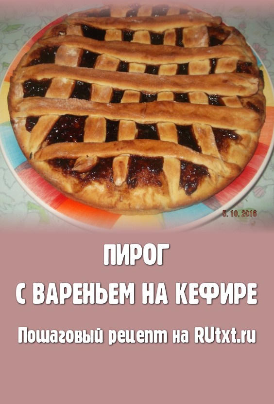 Раскатываем оставшееся тесто и вырезаем одинаковой ширины полоски. Выкладываем полоски крест на крест на сформированную форму с вареньем. Выпекаем пирог из теста на кефире с начинкой из варенья в разогретой духовке при температуре 160 градусов, примерно, 30 минут.