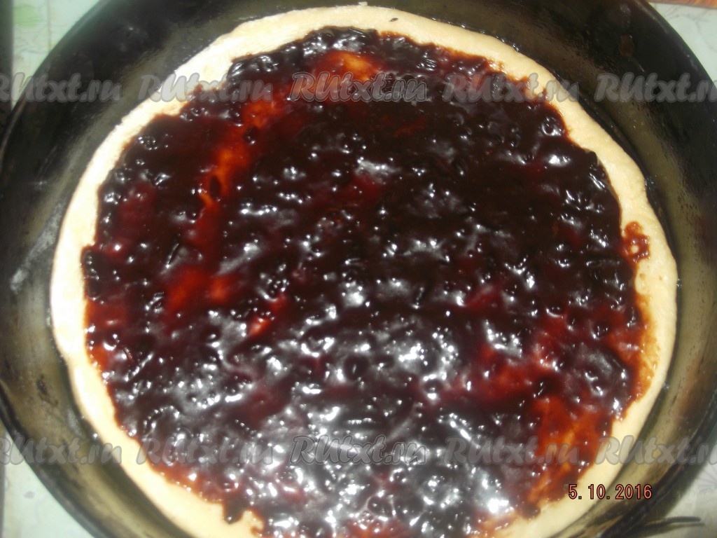 Затем наливаем варенье и распределяем равномерно по тесту.