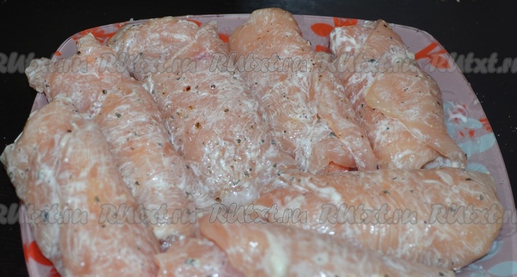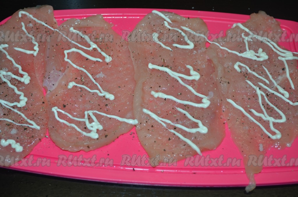 Посолить и поперчить по вкусу, слегка смазать майонезом с обеих сторон. Оставить мариноваться на 1-2 часа.