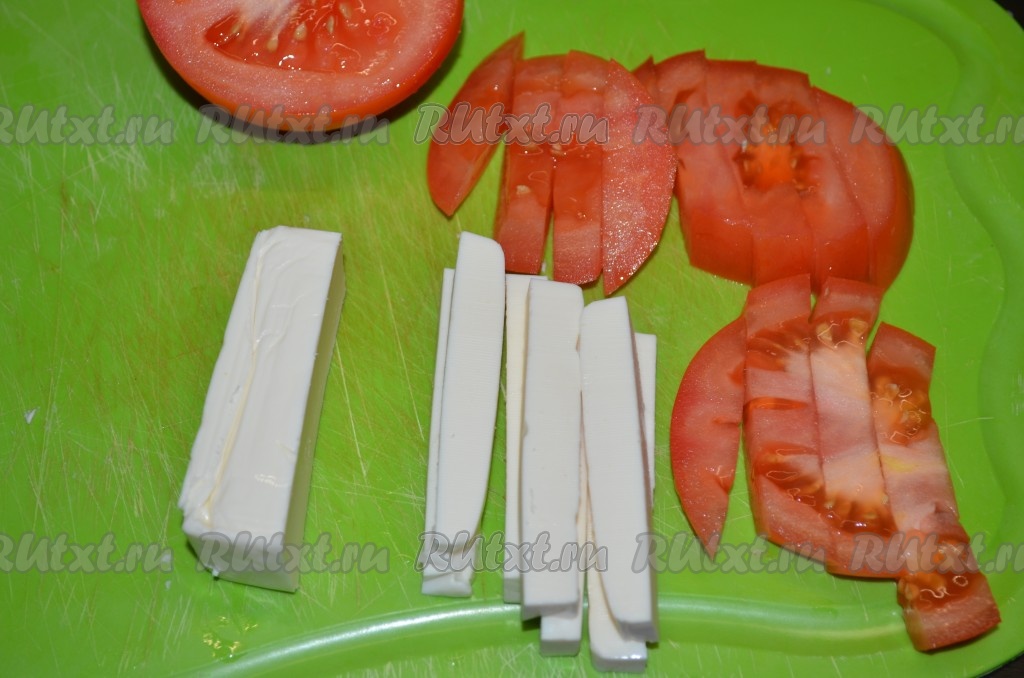 Сыр (я использовала плавленный) и помидор нарезать брусочками толщиной с палец.