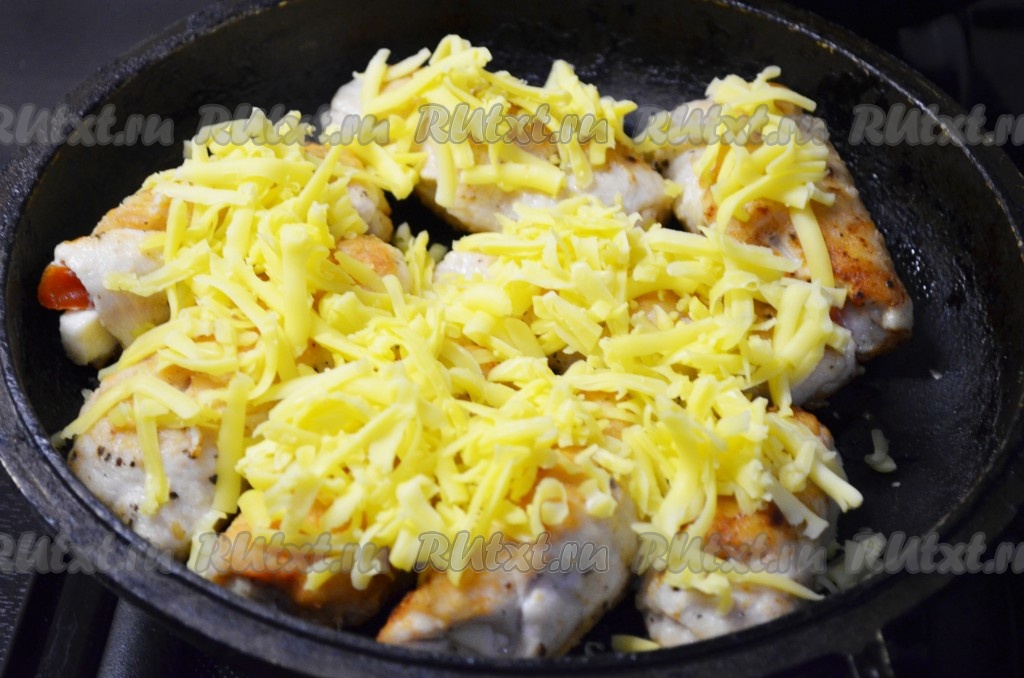 Сложить все куриные рулетики с начинкой из сыра и помидоров в жаропрочную сковороду или форму. Твердый сыр натереть на терке, посыпать рулетики сверху и поставить в разогретую духовку на 5 минут при температуре 220 градусов.