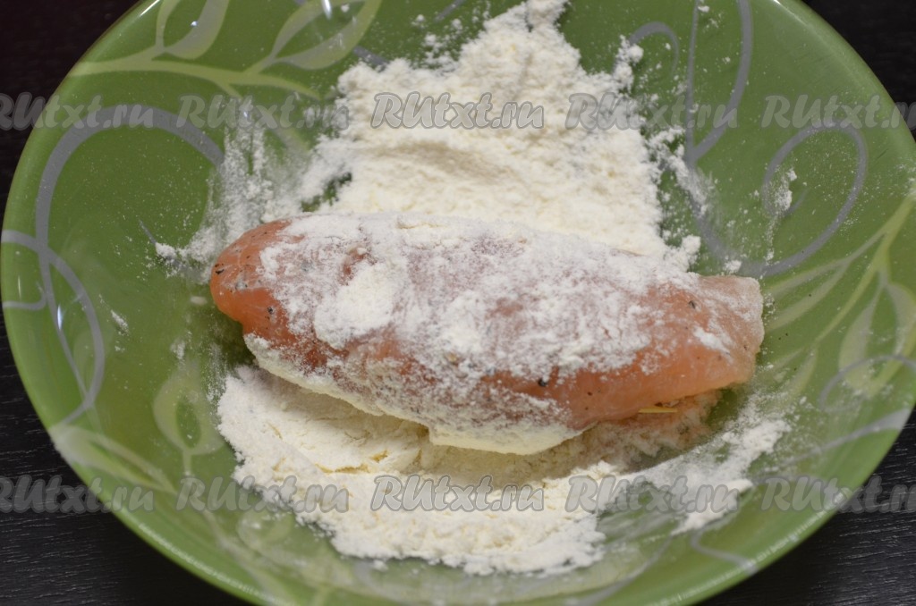 В миску насыпать немного муки, каждый рулетик запанировать с обеих сторон в муке.