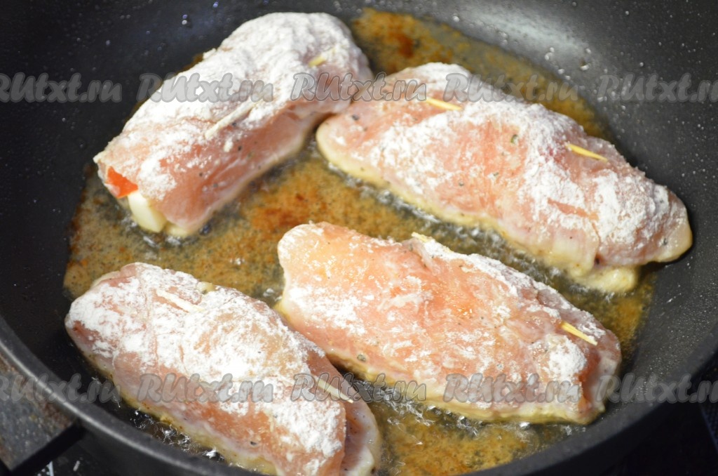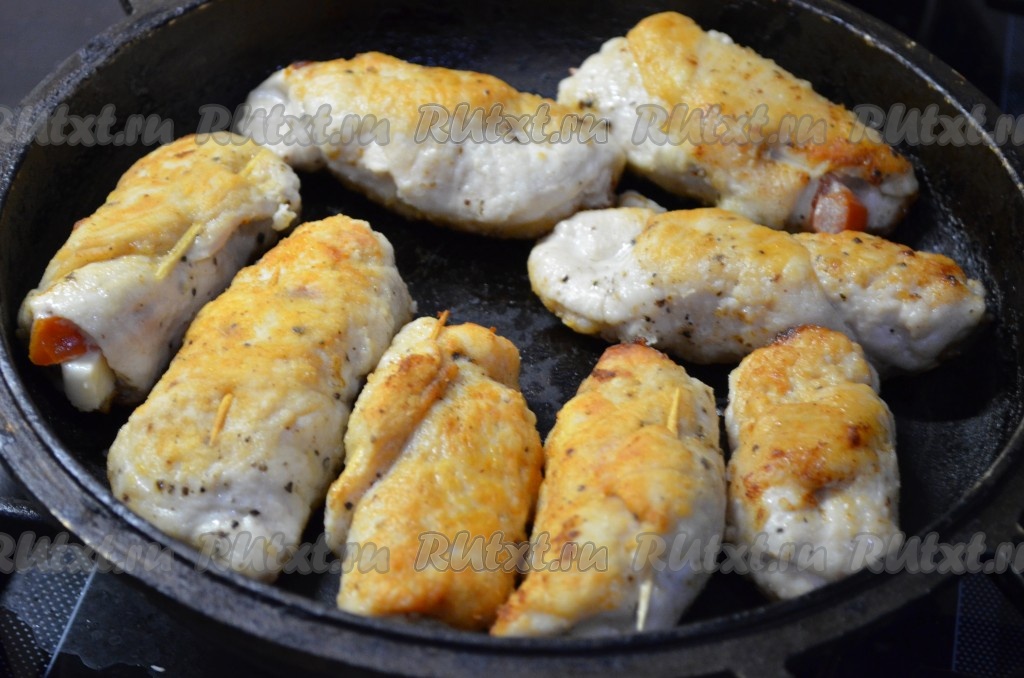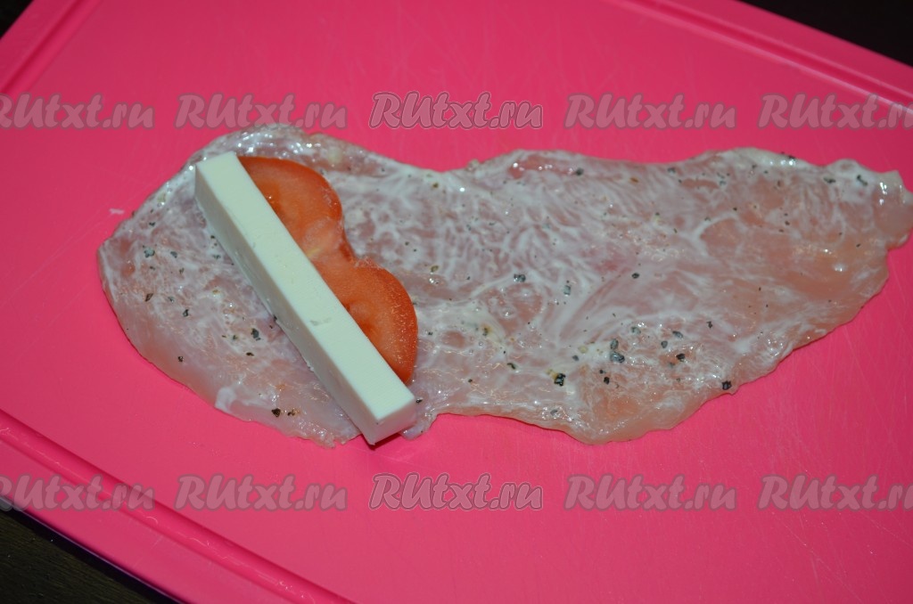 Берем пласт куриного филе, на край кладем по кусочку сыра и помидора, сворачиваем рулетиком. При желании можно скрепить край зубочисткой.