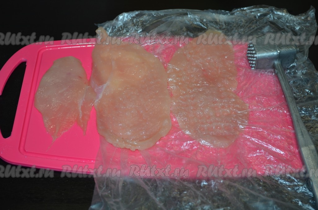 Каждую куриную грудку разрезать на 2 части. Каждую получившуюся часть куриного филе нарезать не толстыми пластами (примерно на 3 части). Каждый пласт слегка отбить молотком с двух сторон через целлофановый пакет.
