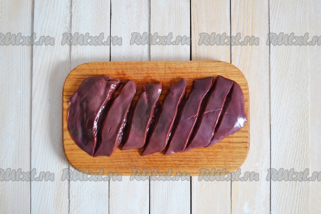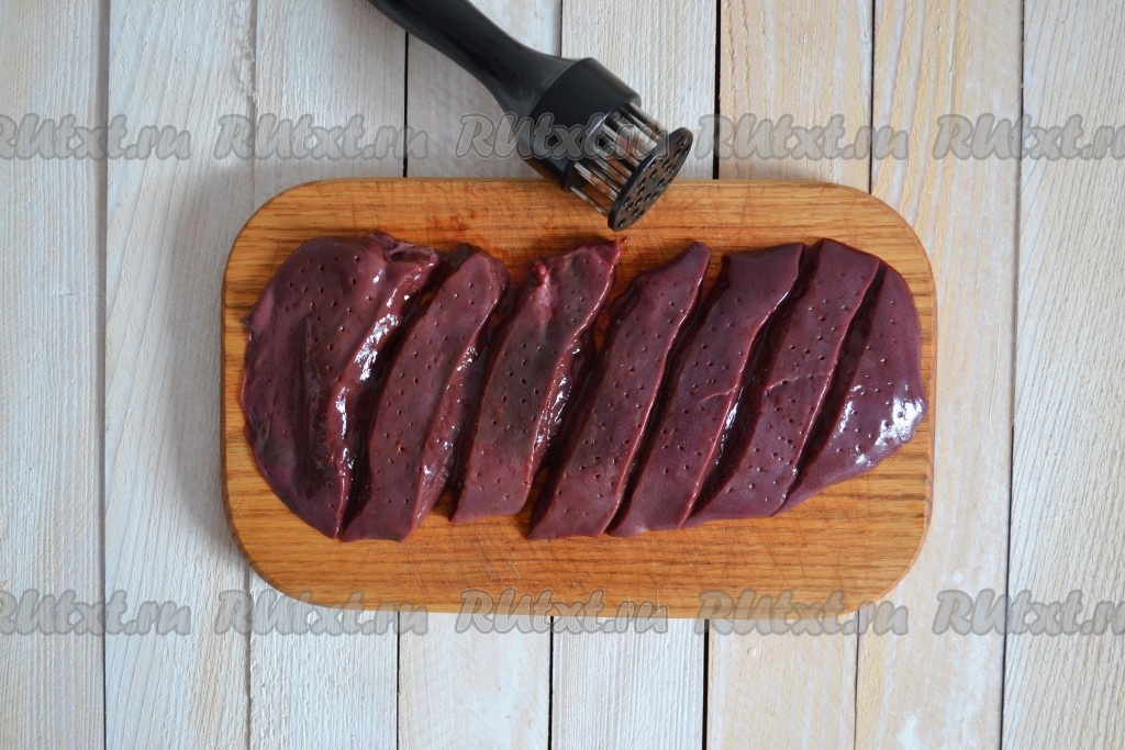 Каждый кусочек проколоть несколько раз тендерайзером или накрыть пищевой пленкой и нежно отбить молоточком. Посолить и поперчить по вкусу с обеих сторон каждый кусочек печени.