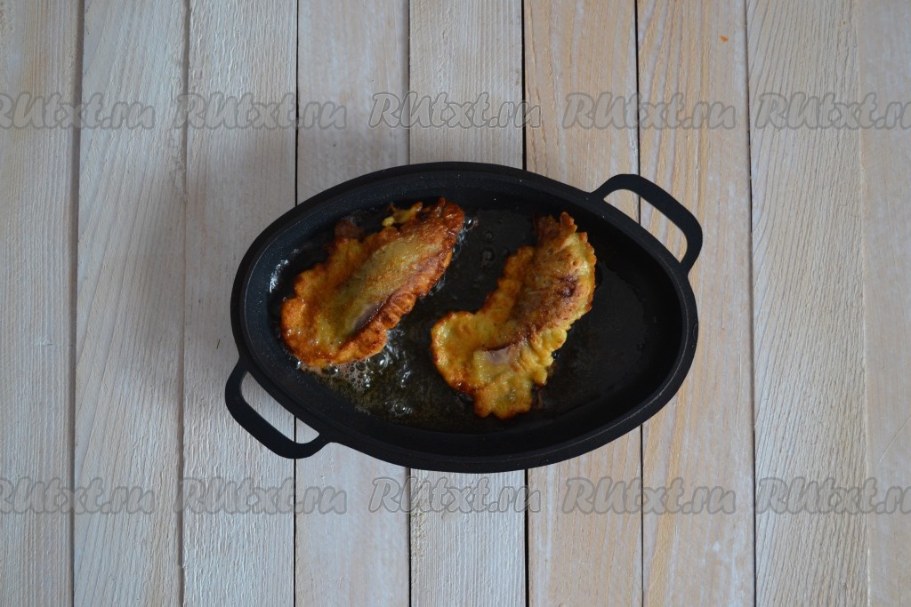 Сковороду хорошо разогреть и влить масло. Прогреть его хорошо. Каждый кусочек свиной печени обмакнуть в кляр и выложить на разогретую сковороду. Обжаривать с каждой стороны по 7-10 минут на слабом огне. При прокалывании готовой печени ножом, из нее не должен выделяться красный сок.