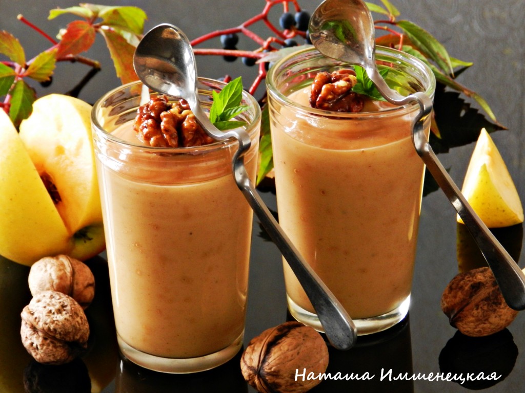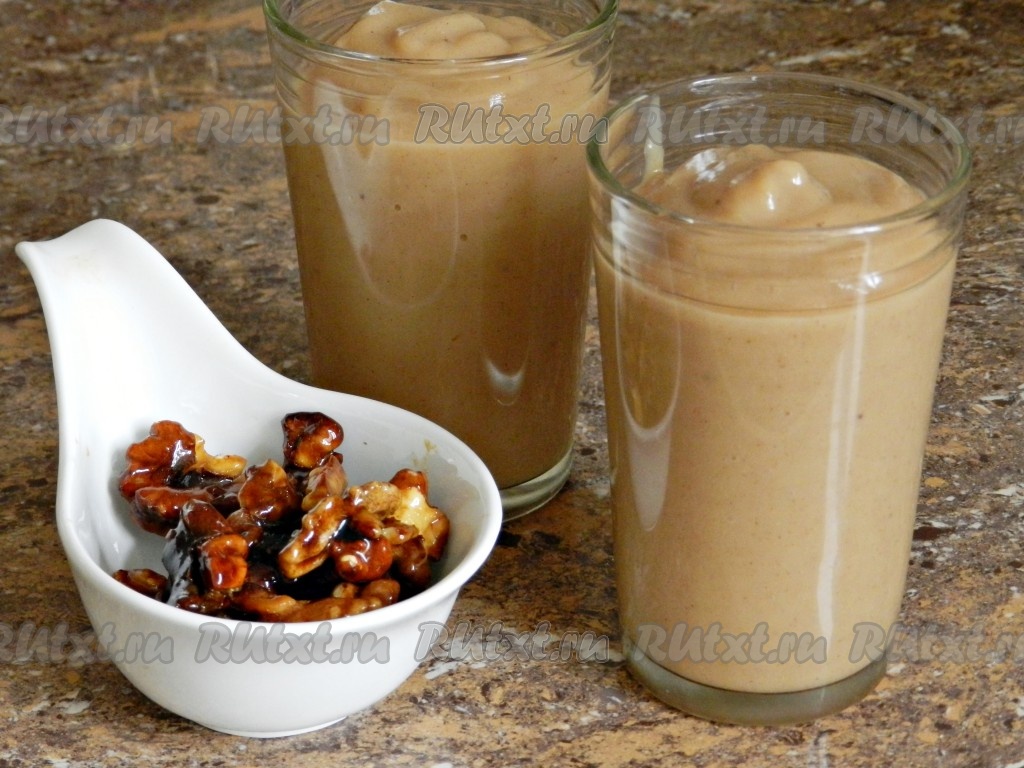 При подаче я украсила смузи обжаренными грецкими орехами в мёде. Вкусный и полезный смузи, приготовленный из печёных яблок и банана, можно сразу подавать к столу, а можно перед подачей немного охладить его в холодильнике.