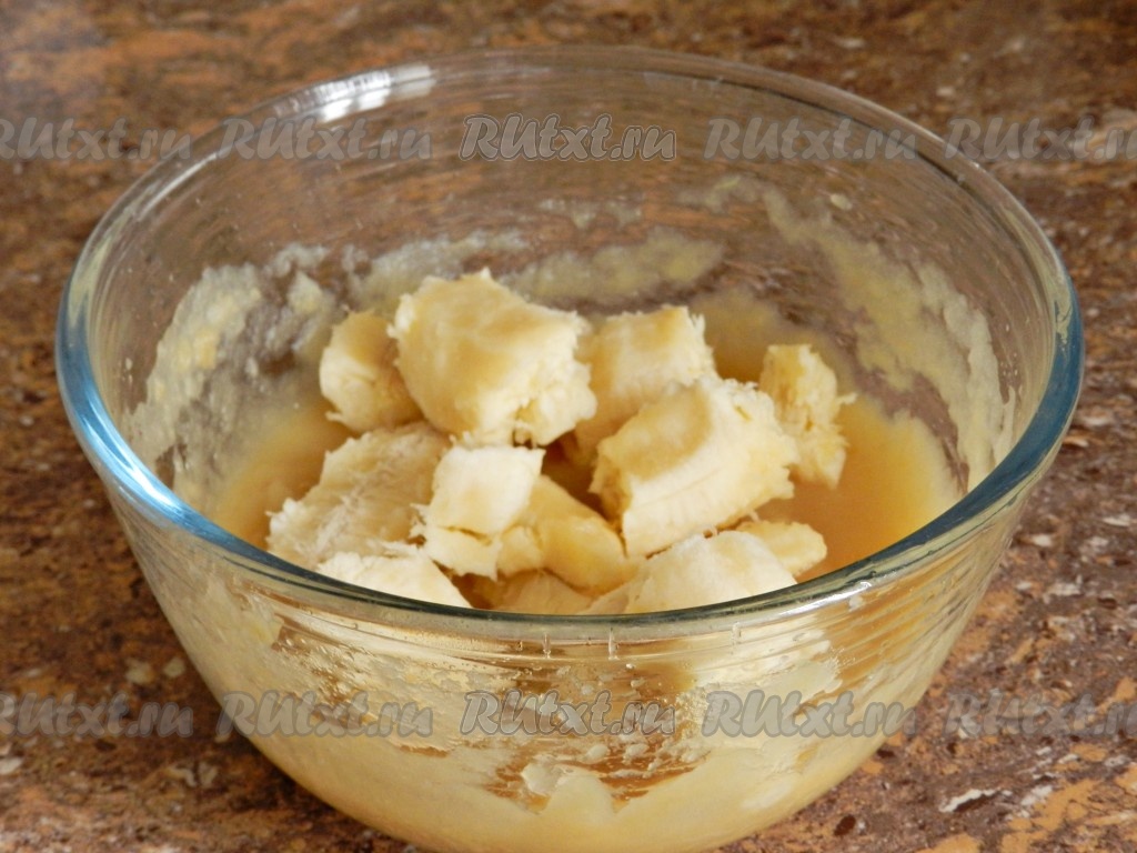 К получившемуся яблочному пюре добавить очищенный банан, разломанный на кусочки. Взбить яблочное пюре с бананом погружным блендером до получения однородной, пышной массы.