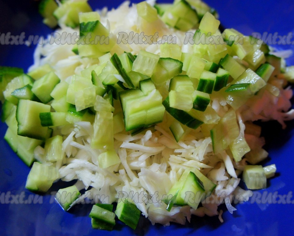 Огурец нарезать мелким кубиком и добавить к капусте.