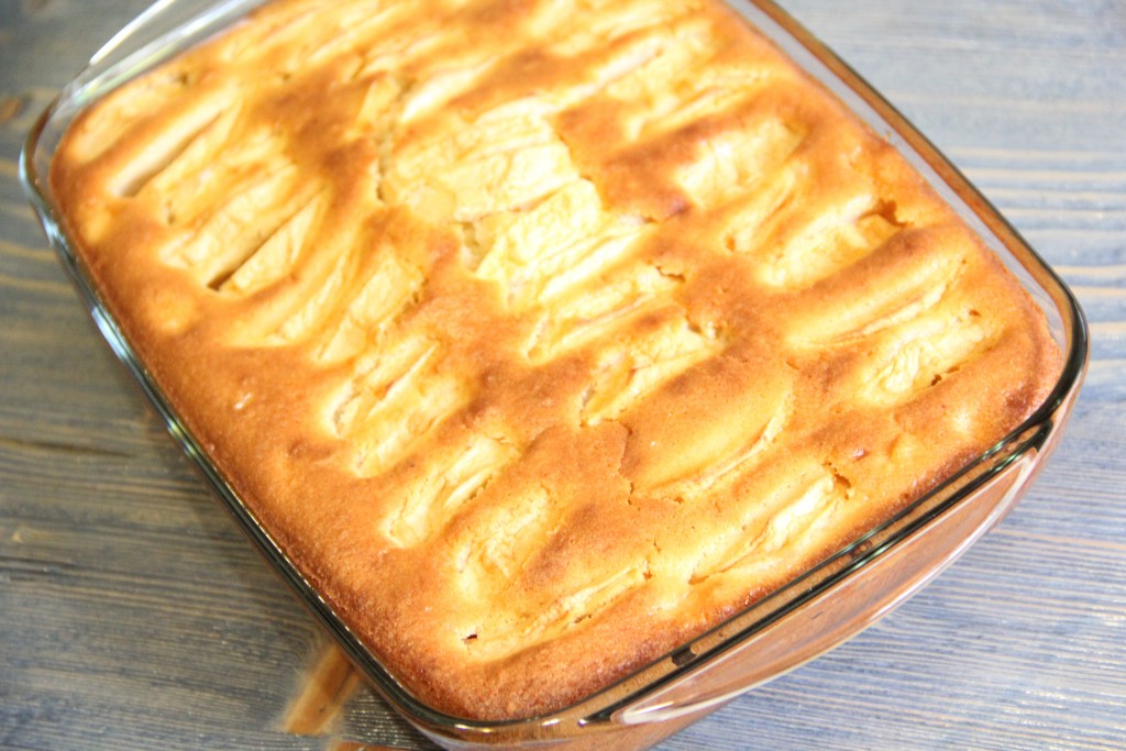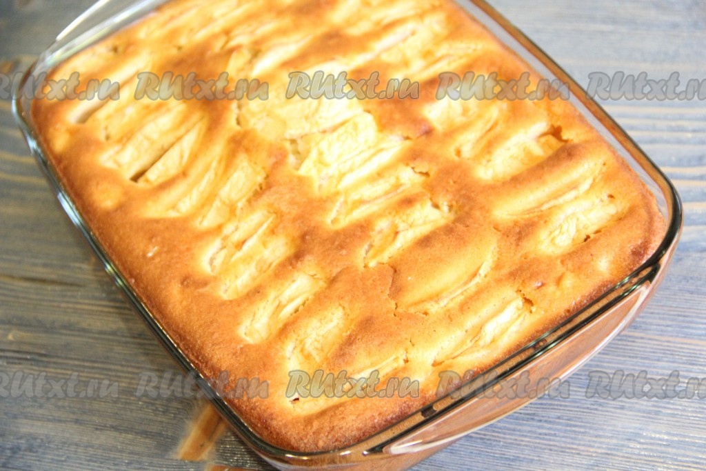 Достать пирог из духовки. Готовый пирог с яблоками покроется красивой золотистой корочкой.