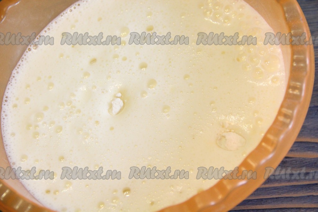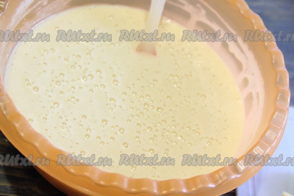 Затем добавить в яичную массу молоко и растительное масло, ещё раз взбить до однородного состояния.