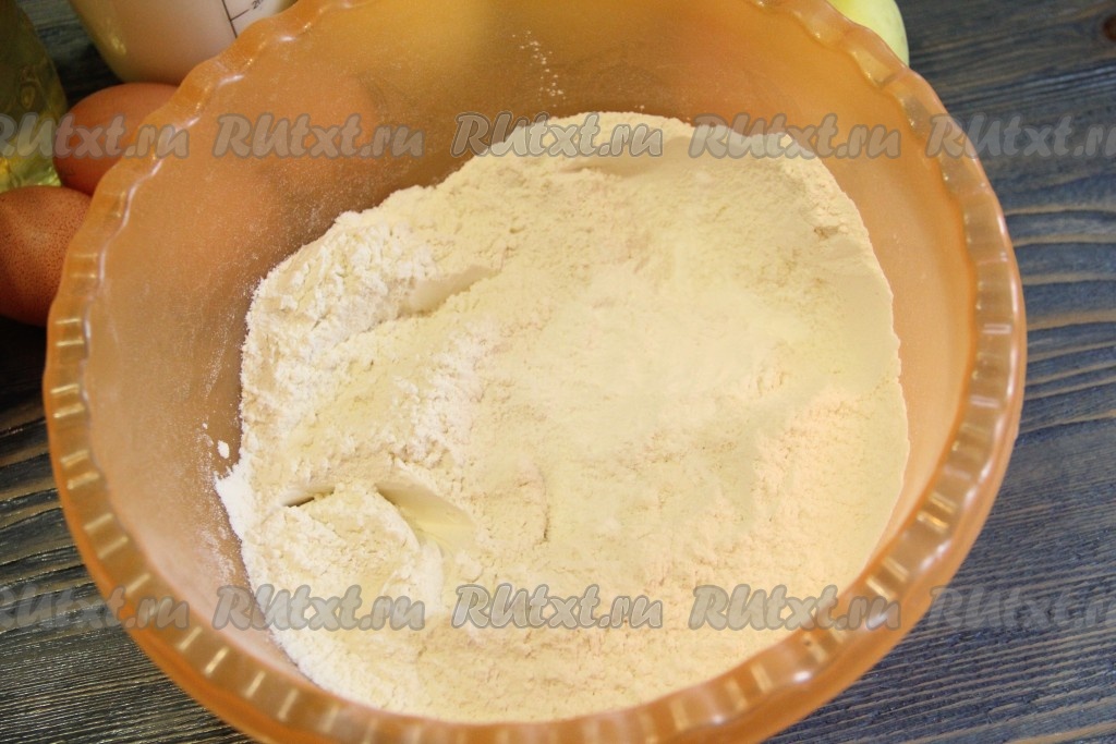 Просеять в глубокую миску муку и смешать с разрыхлителем и солью.