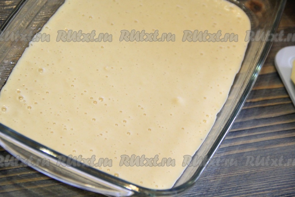 Форму для выпекания смазать растительным маслом. Вылить часть теста на дно формы.