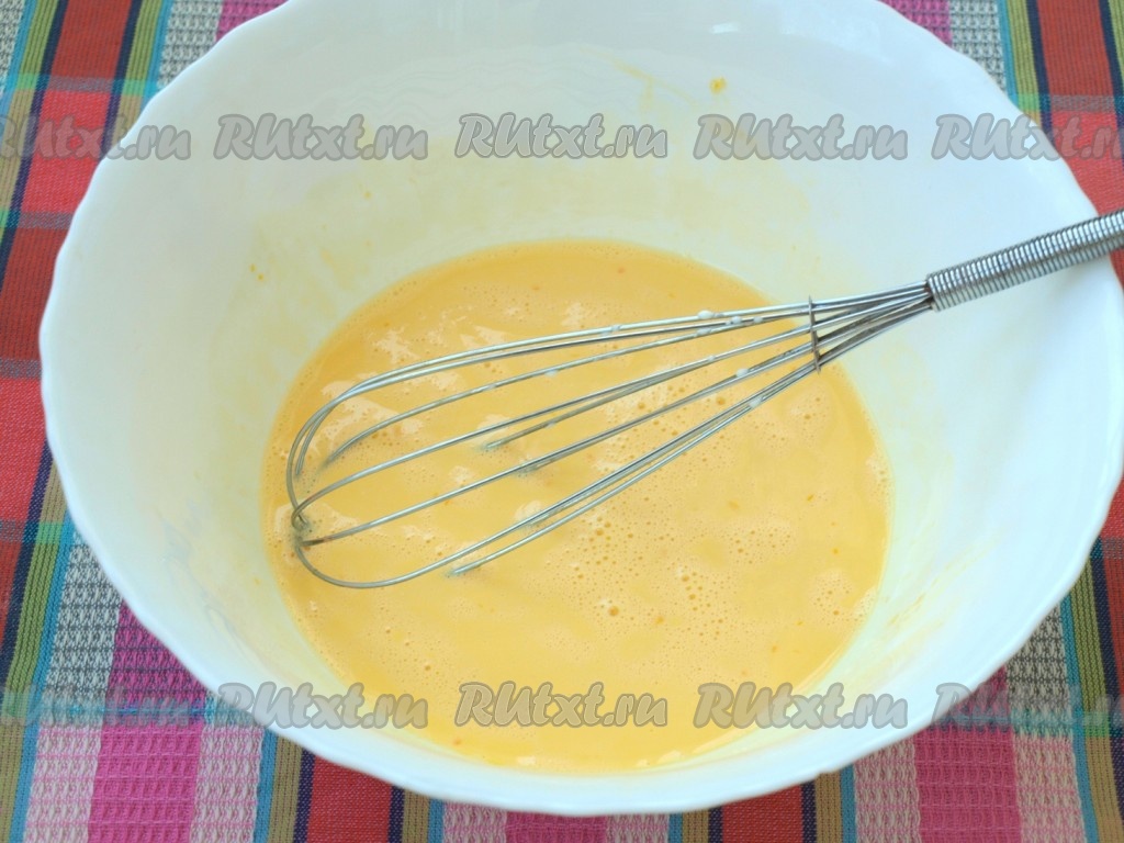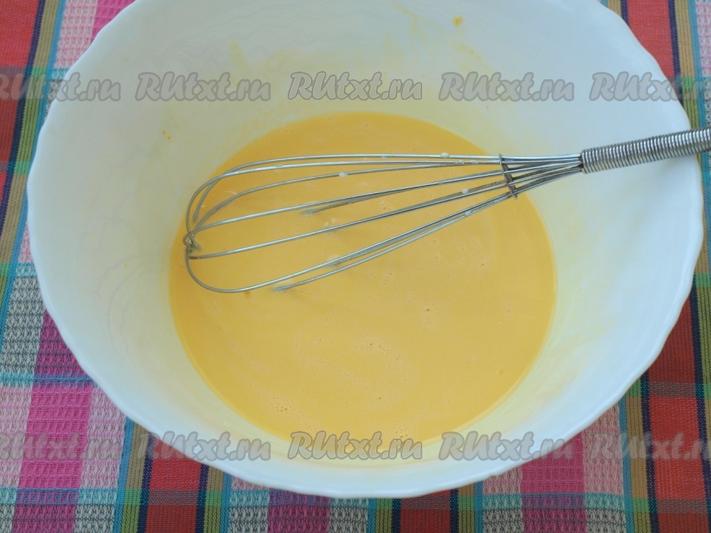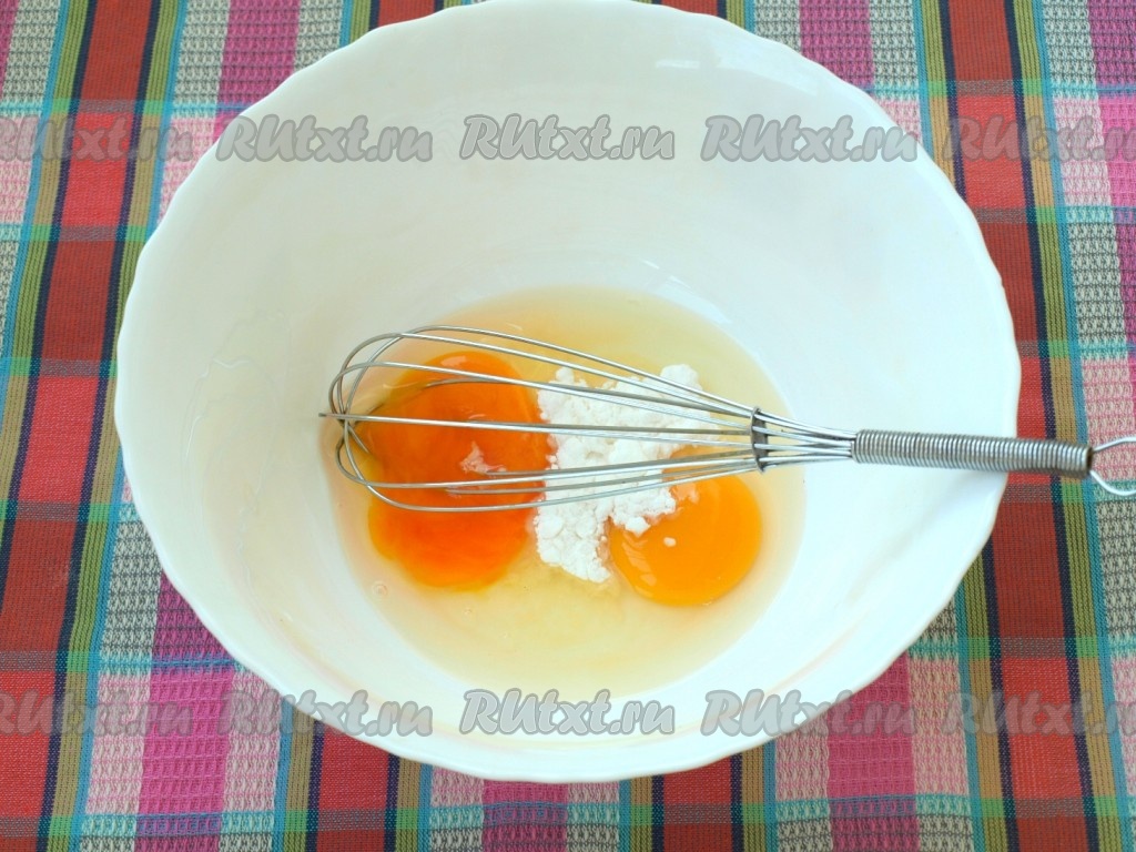 В глубокую миску разбить яйца и добавить к ним сахарную пудру, взбить при помощи венчика.