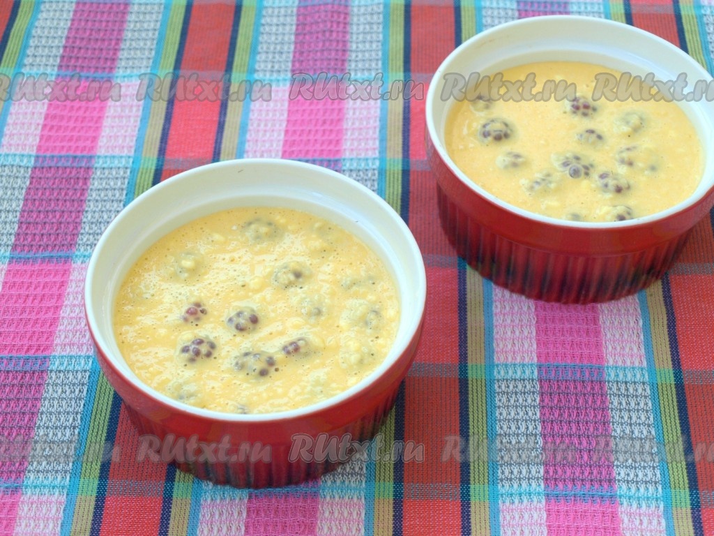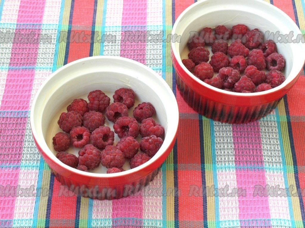 Порционные формочки смазать сливочным маслом. На дно выложить сухие ягоды малины.
