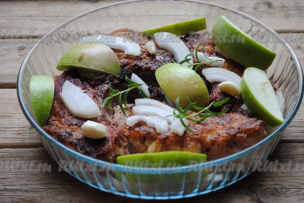 На мясо выложить очищенные зубчики чеснока, нарезанный полукольцами лук, веточки розмарина и яблоко, нарезанное дольками.