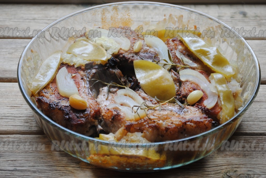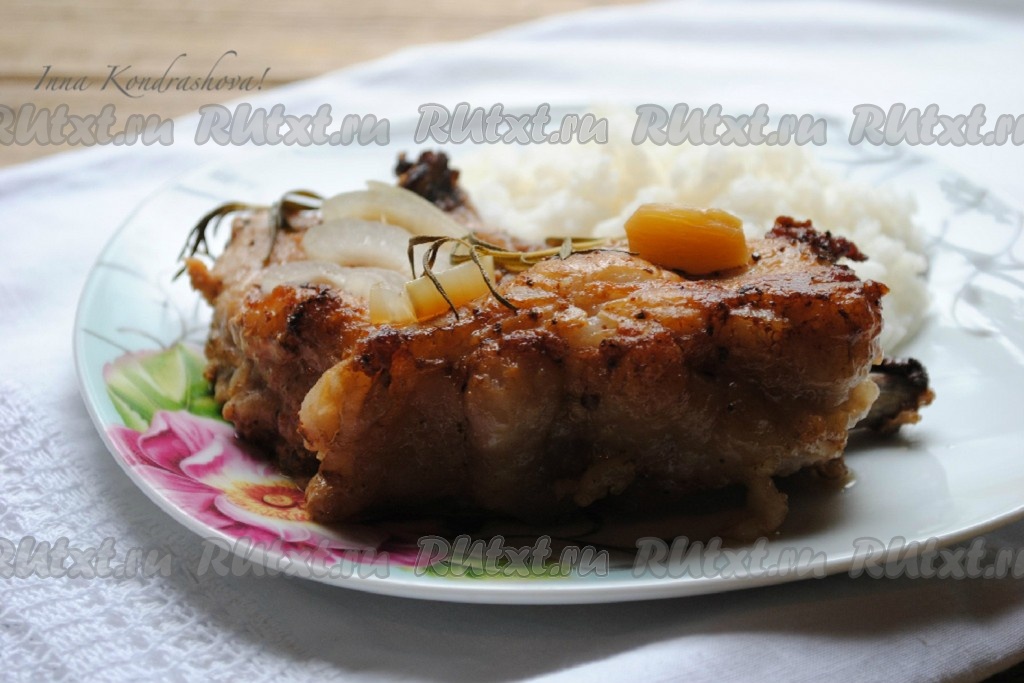 Очень вкусная, сочная свиная корейка на кости, запеченная в духовке, готова.