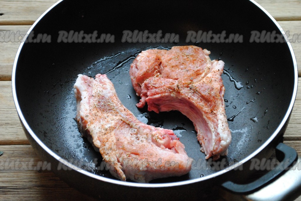 Сковороду хорошо разогреть с растительным маслом и обжарить свиную корейку на сильном огне по три минуты с каждой стороны.