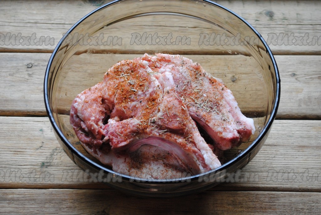 Каждый кусок мяса хорошо натереть солью, перцем и приправой к мясу, оставить на 30 минут, чтобы мясо пропиталось специями.