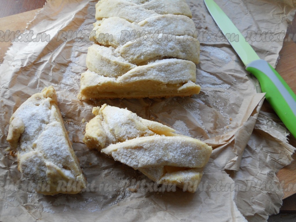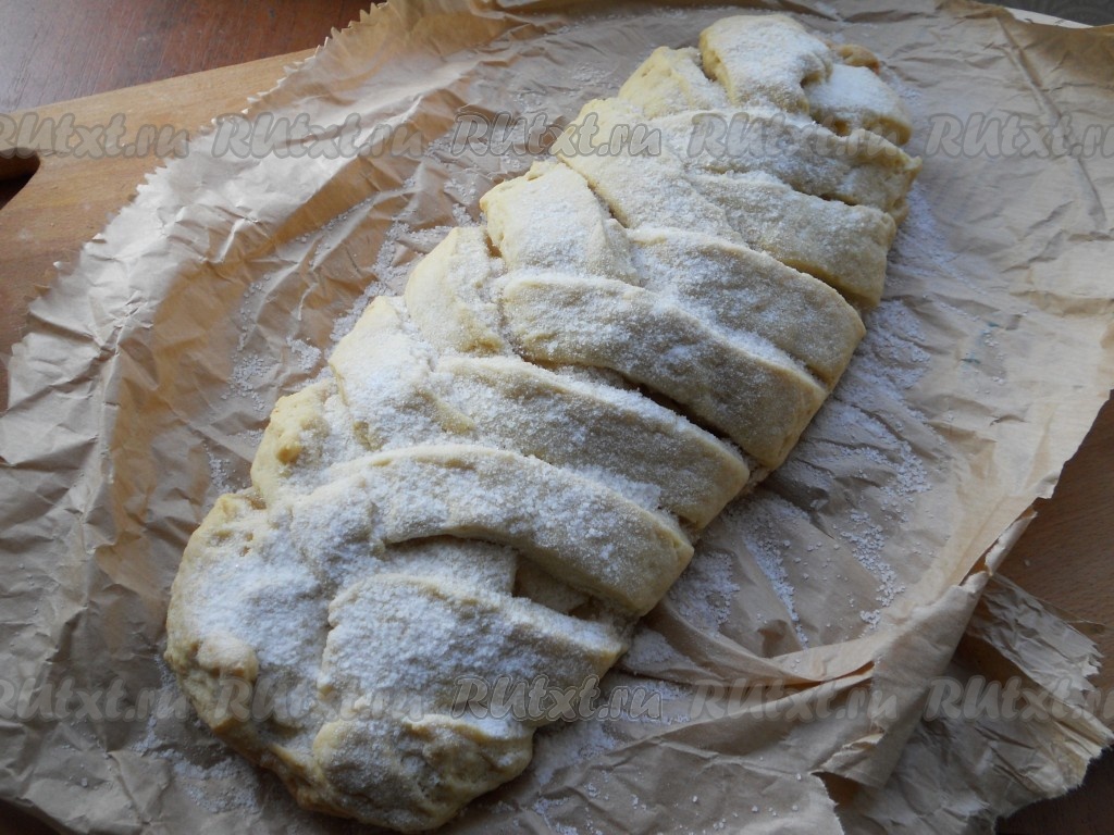 Верхнюю (узкую) часть "овала" подвернуть на начинку, затем, формируя плетёнку, как косичку, накрыть полосочками теста яблоки (берём полосочку справа, кладём на начинку, сверху накрываем полосочкой слева, снова берём полоску справа, а затем - слева, продолжая формировать плетёнку), нижнюю узкую часть овала тоже подвернуть на начинку. Таким же образом сформировать и второй пирог. Можно сделать и одну большую плетёнку. Перенести плетёнку вместе с пергаментом на противень и отправить в разогретую духовку. Выпекать творожную плетёнку с яблоками 30-40 минут при температуре 190-200 градусов. Готовую выпечку остудить, посыпать сахарной пудрой.