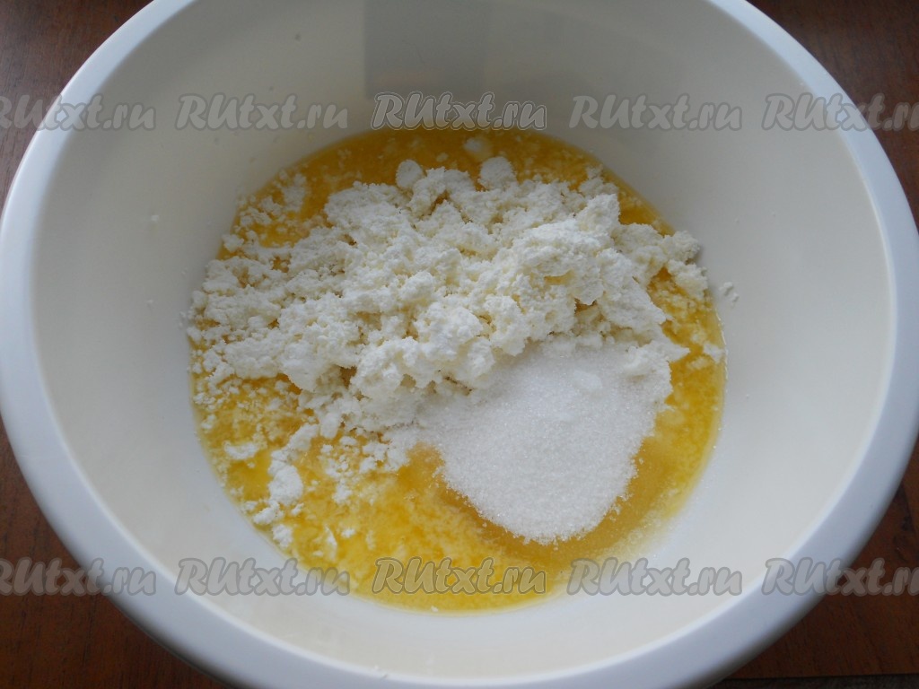 Масло сливочное растопить, немного остудить, переложить в объёмную миску, затем всыпать 2 столовые ложки сахара, ванильный сахар, добавить творог.